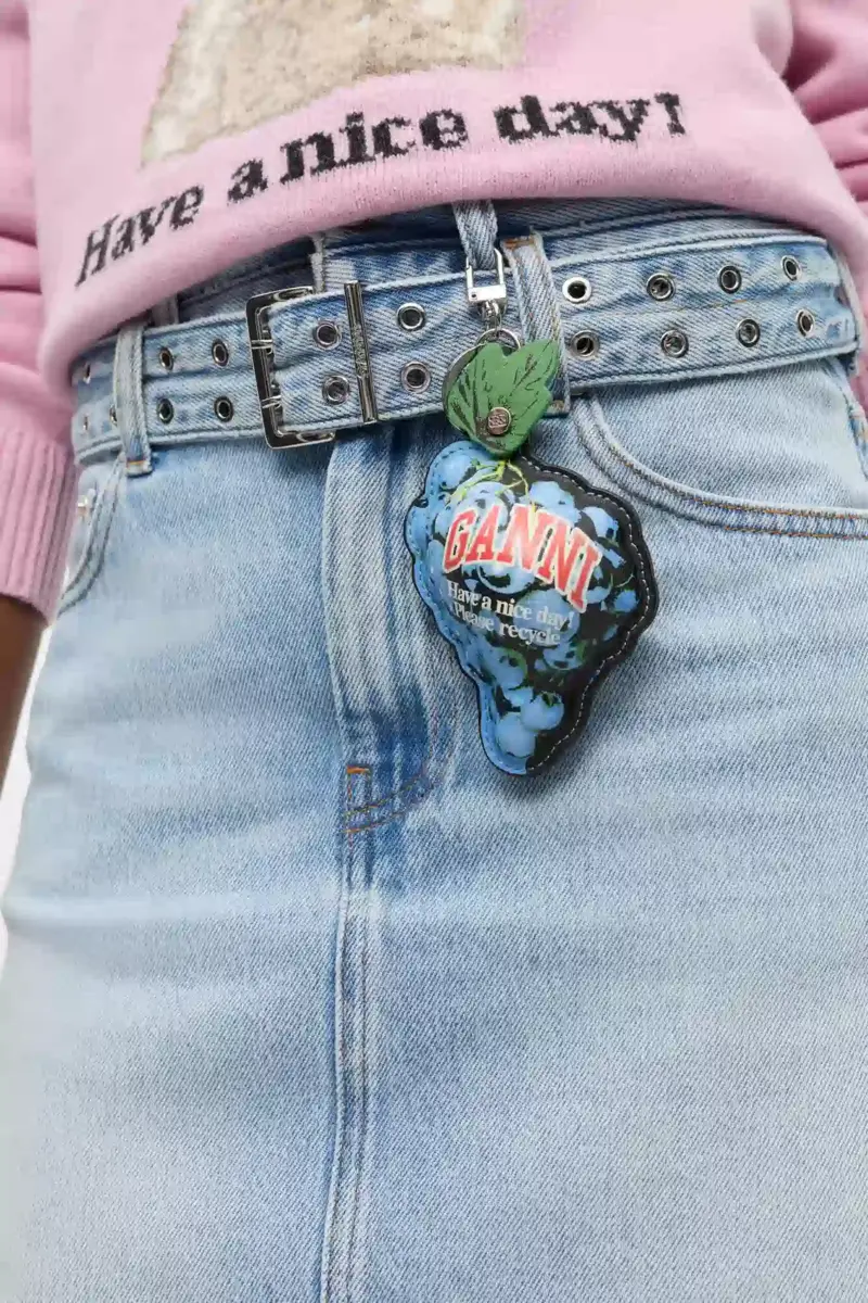 This coin purse is designed in the shape of a grape cluster and features a silver-tone split ring and clasp, a GANNI logo and a ‘Have a nice day! Please recycle!’ message.
