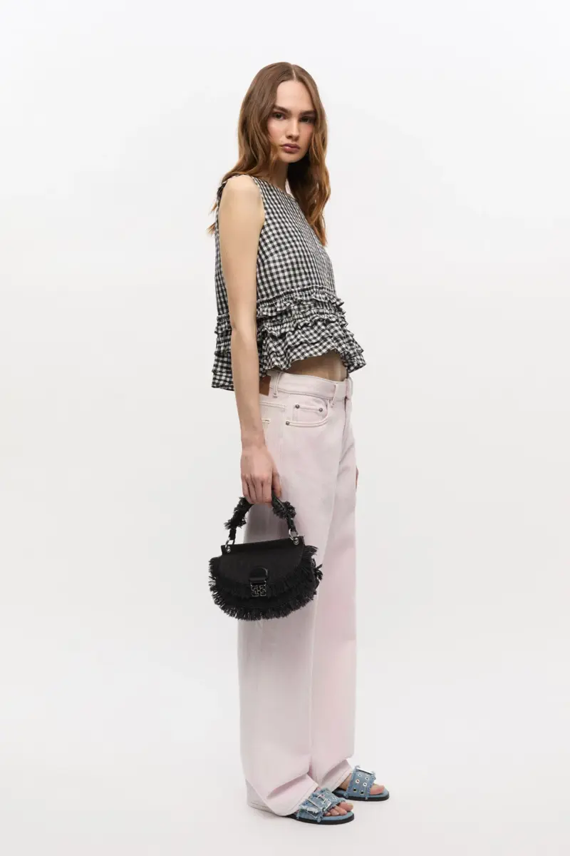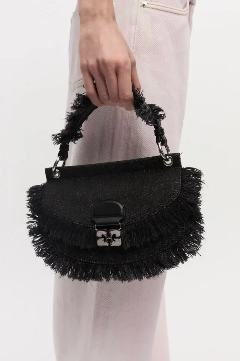 This bag features a structured silhouette, a top handle and an adjustable and removable shoulder strap. The bag has a magnetic closure with the signature GANNI Butterfly clasp in silve