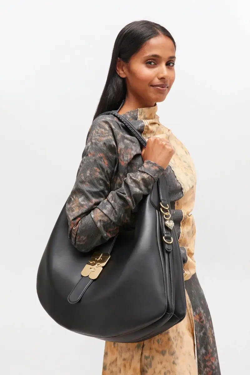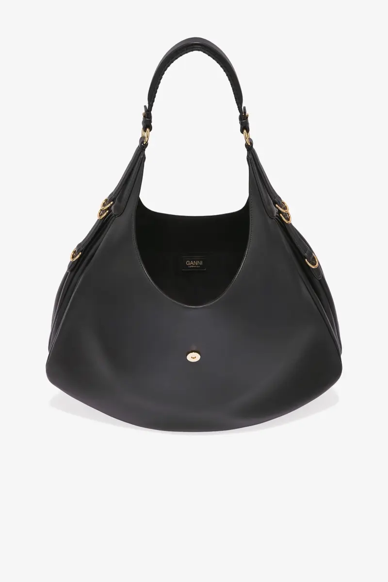 This bag features a accordian-style silhouette, a shoulder strap and D-ring detailing at the side. The bag has a tab closure with the signature GANNI Butterfly clasp in gold-tone, 1 ma