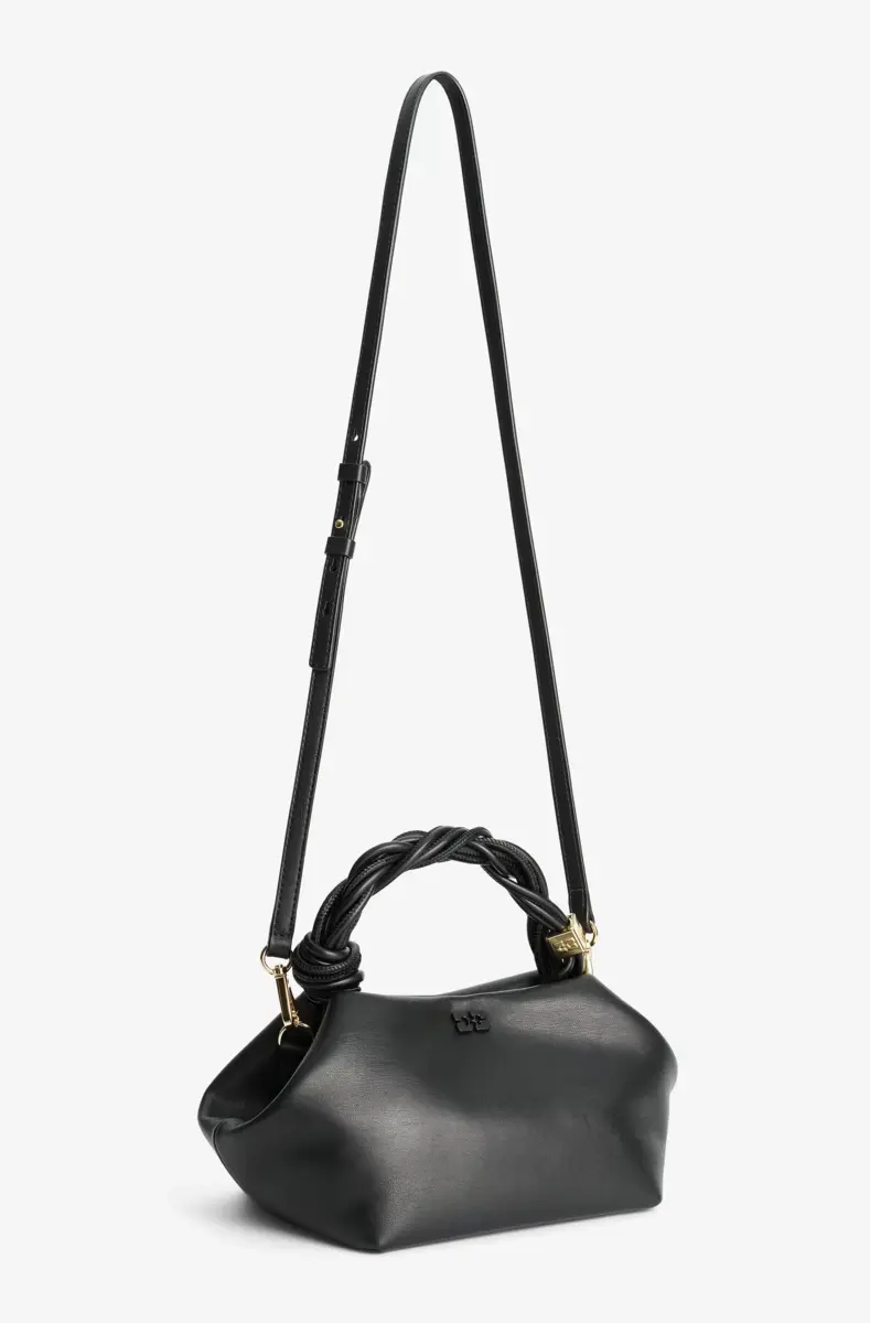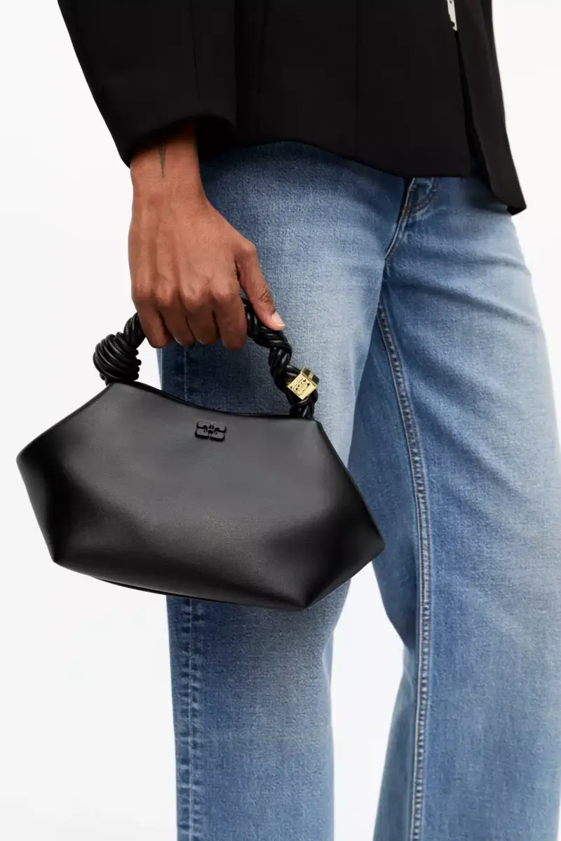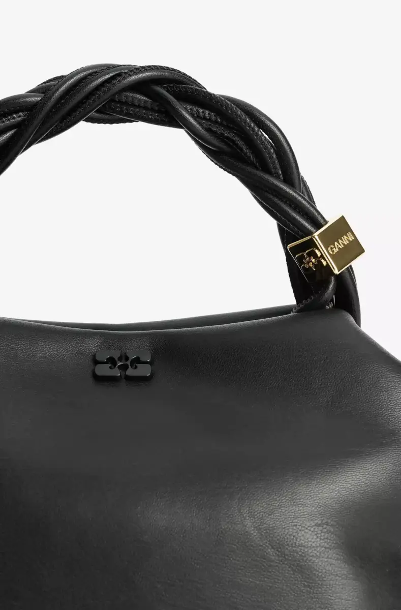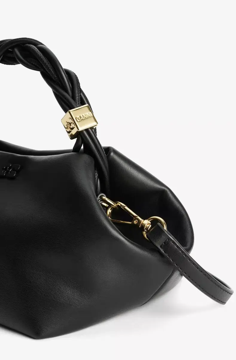 This bag features a tone-on-tone metallic GANNI Butterfly logo, a twisted handle with a braided knot, and a gold-tone metallic dice with a GANNI Butterfly logo engraved. The bag has an