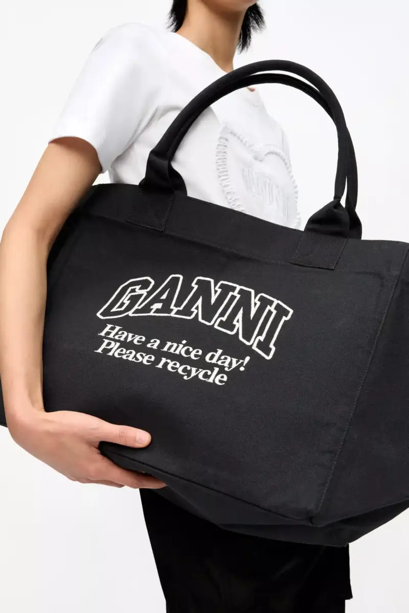 This tote bag features top handles, one large compartment, and a GANNI logo with the phrase ‘Have a nice day! Please recycle’.