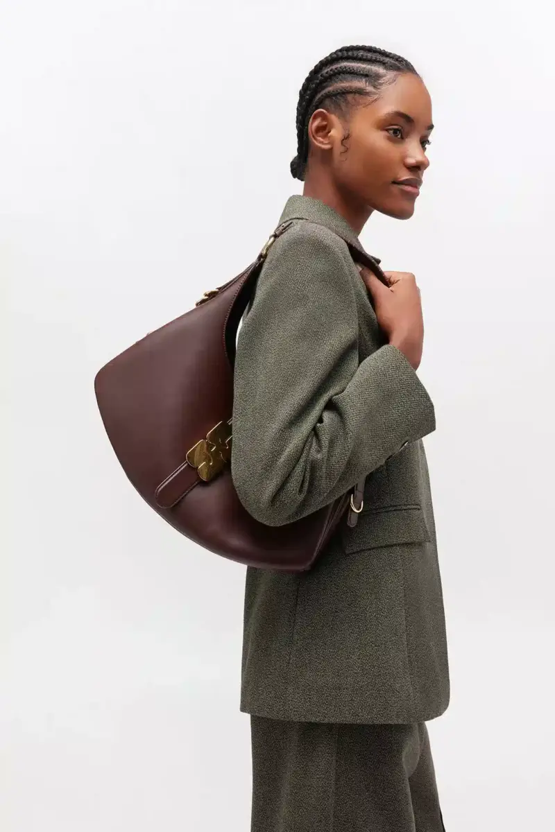 This bag features a accordian-style silhouette, a shoulder strap and D-ring detailing at the side. The bag has a closure tab with the signature GANNI Butterfly clasp in gold-tone, 1 ma