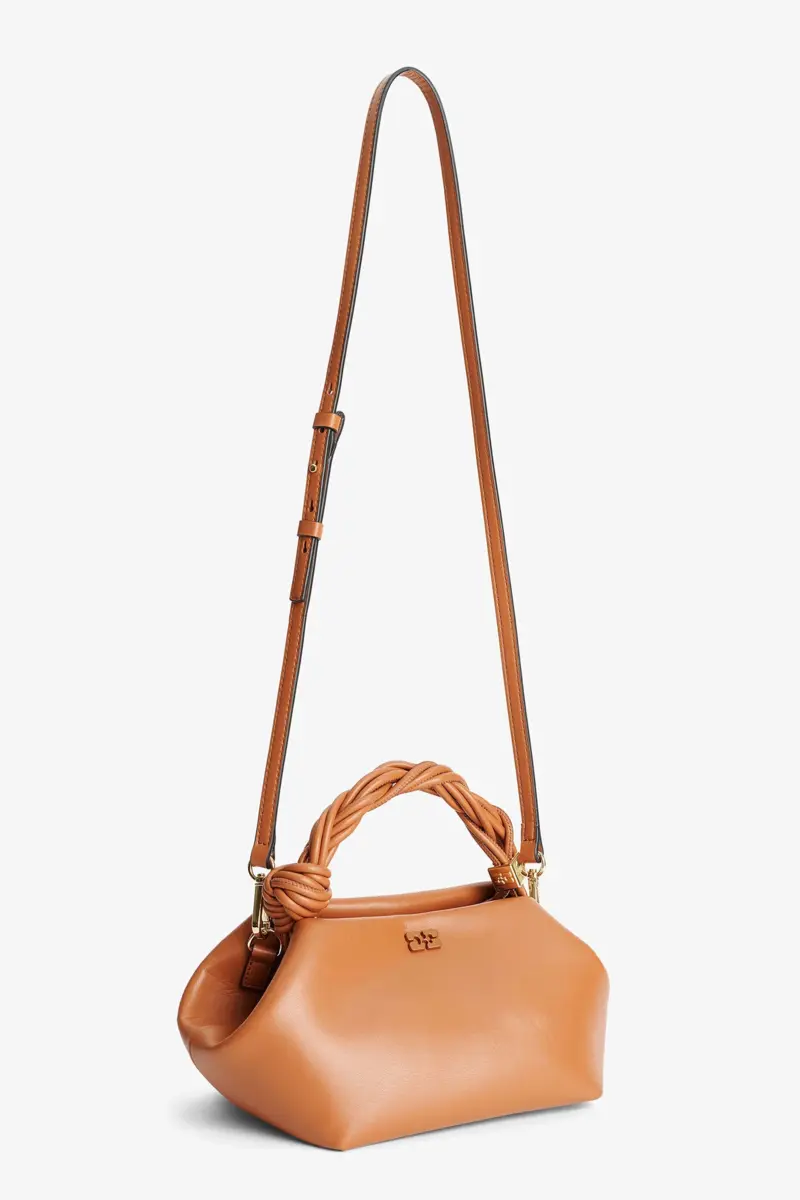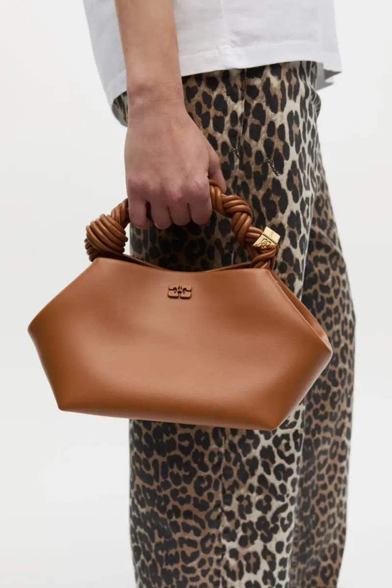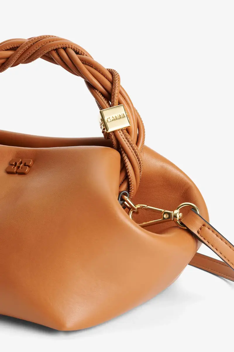 This bag features a tone-on-tone metallic GANNI Butterfly logo, a twisted handle with a braided knot, and a gold-tone metallic dice with a GANNI Butterfly logo engraved. The bag has an
