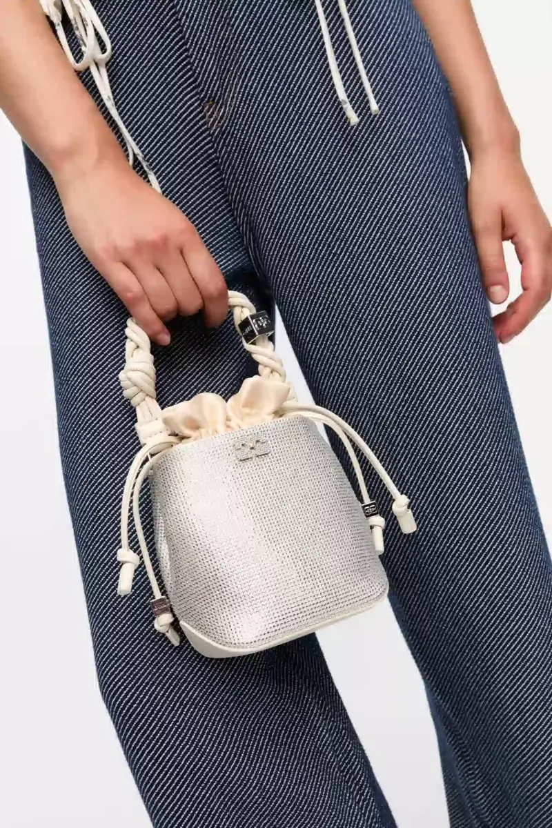 This bag features a braided top handle with knot detail and an adjustable and removable strap. The bag has a drawstring pouch, an embossed logo on the back, and an internal flat pocket