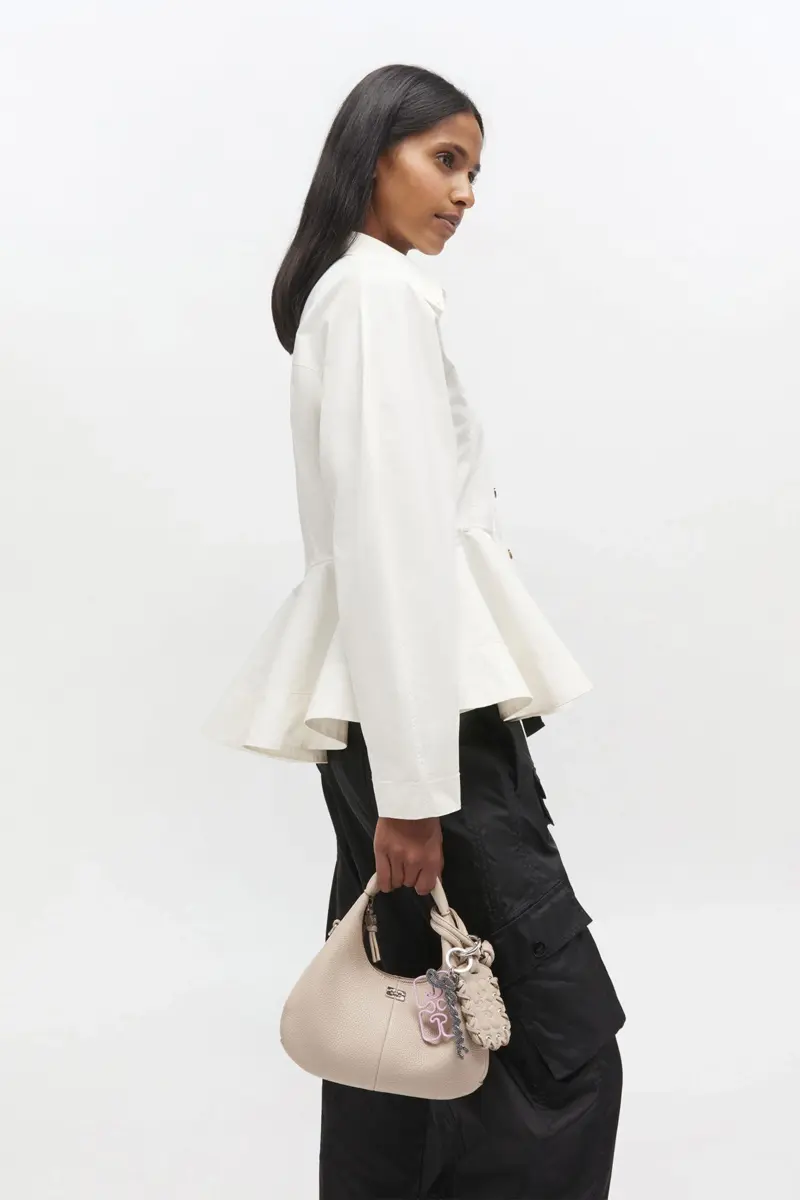 This bag features a top handle, adjustable and removable strap and a zipper closing. The bag has a mirror hangtag and an internal pocket.