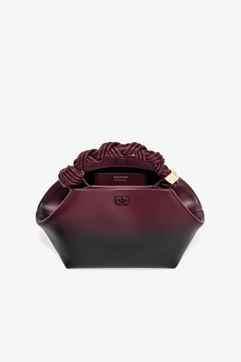 This bag features a tone-on-tone metallic GANNI Butterfly logo, a twisted handle with a braided knot, and a gold-tone metallic dice with a GANNI Butterfly logo engraved. The bag has an