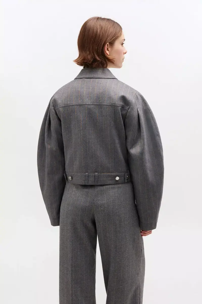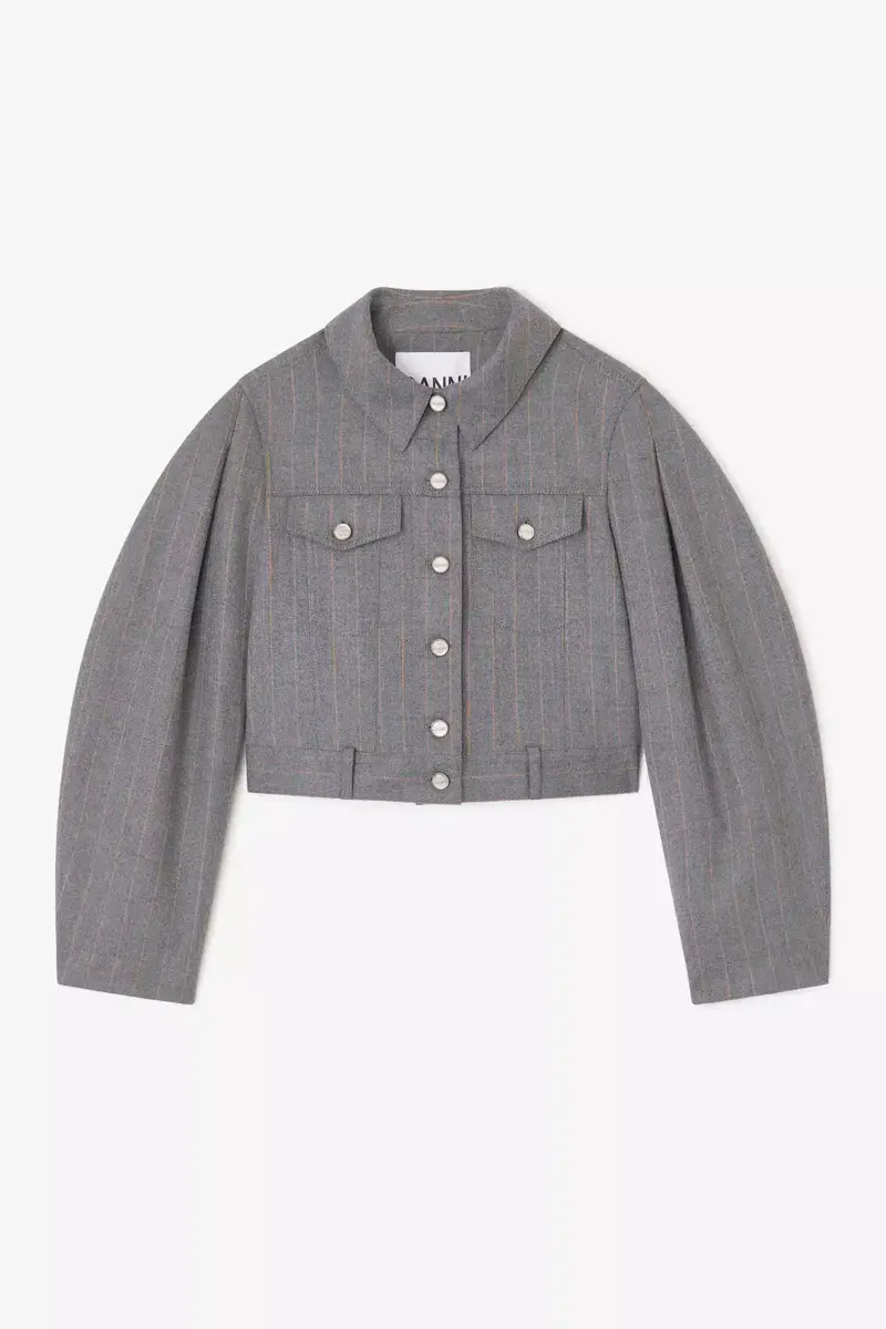 This striped jacket features a classic collar, button-front closure, belt loops and 2 chest pockets.
