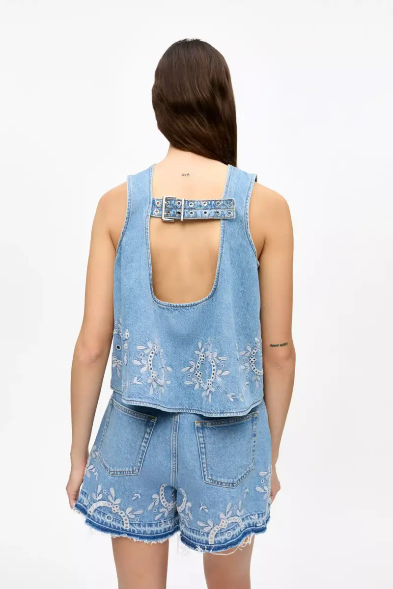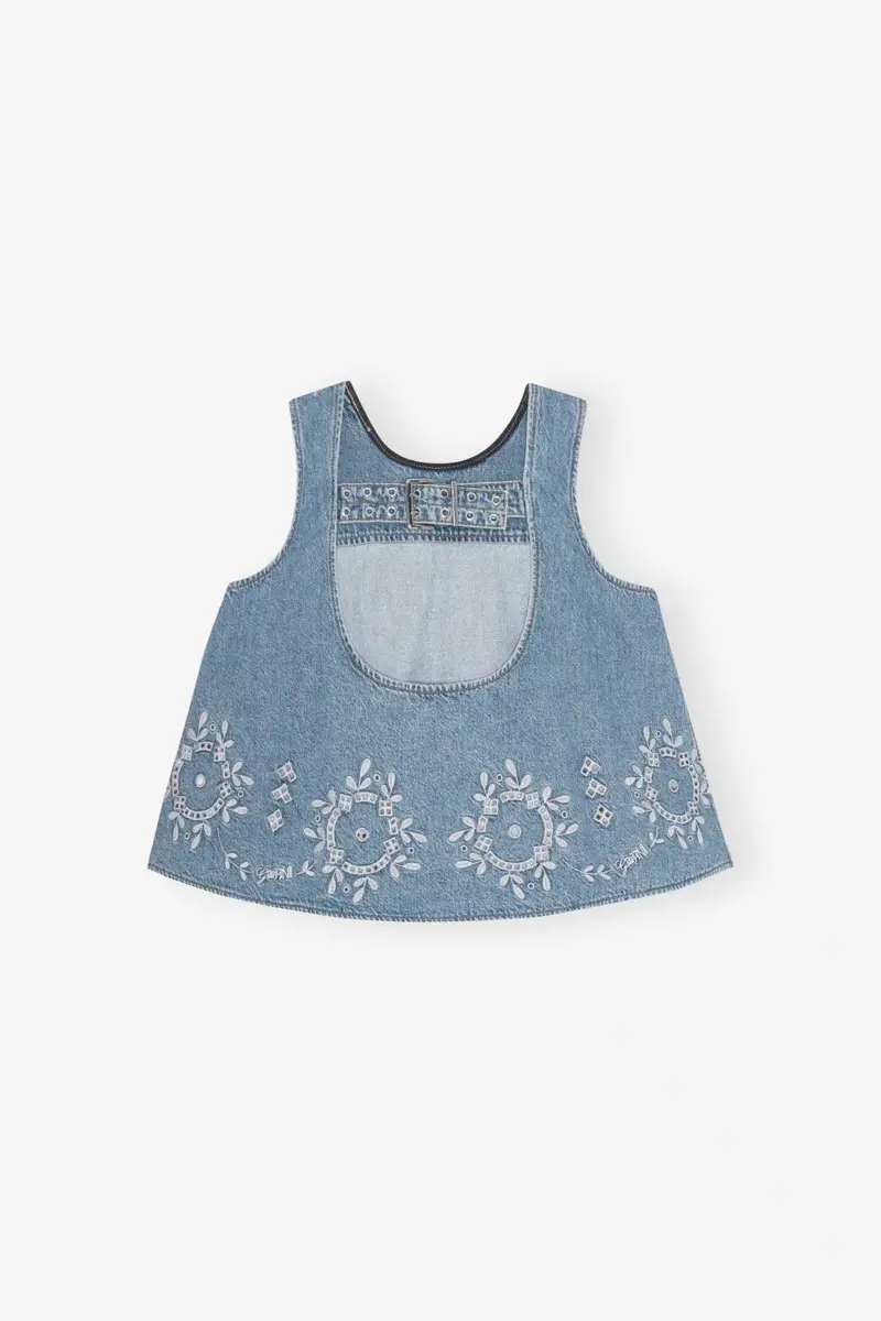 This top in denim features a rounded neckline, buckle clousure at back and broderie anglaise detailing at the hem.