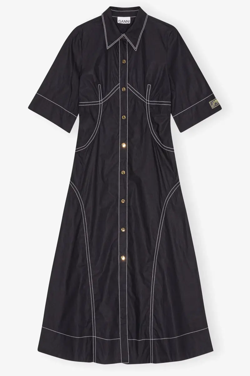 This Black Cotton Poplin Shirt Dress features a collar, button closure, short sleeves and a sewn-on GANNI logo patch.