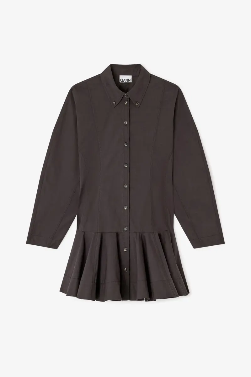 This dress features a classic collar, button-front closure, drop waist and ruffled hem detail.