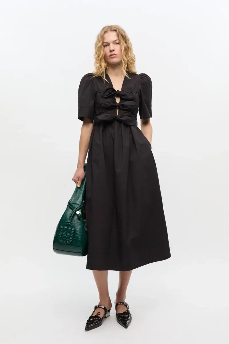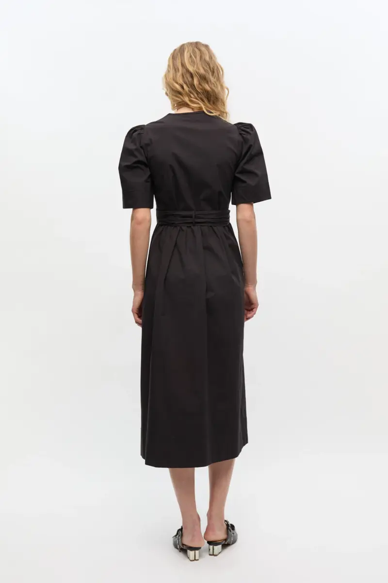 This dress features a deep v-neckline with three tie bands at the front, belt loops, short and puffed sleeves, side pockets and a flared skirt.