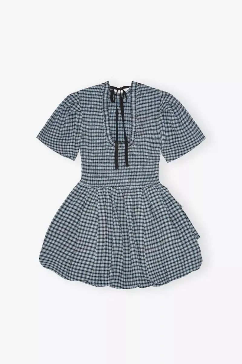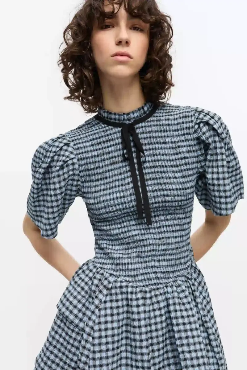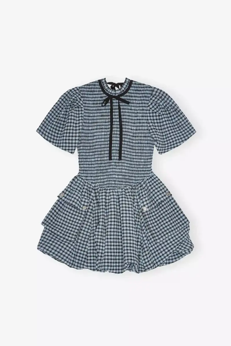 This Blue Seersucker Check Mini Smock Dress features a high neck, tie detail, short sleeves, two side cargo pockets and a balloon skirt.