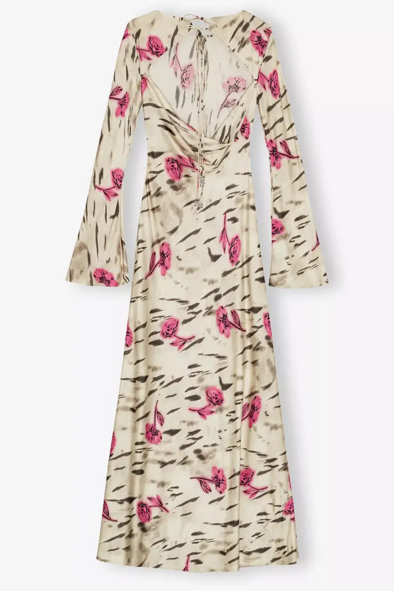 This dress in floral printed stretch satin has a round neck, long sleeves and an open back with tie strings.