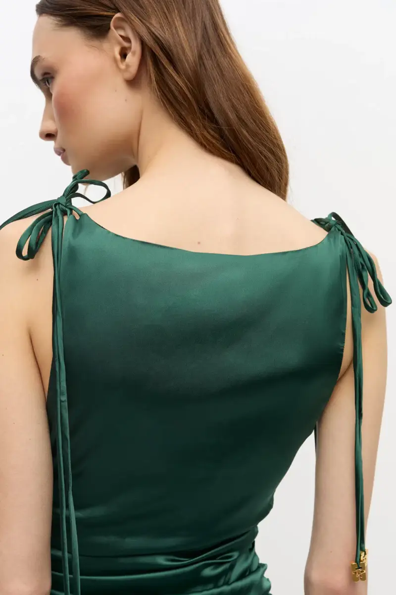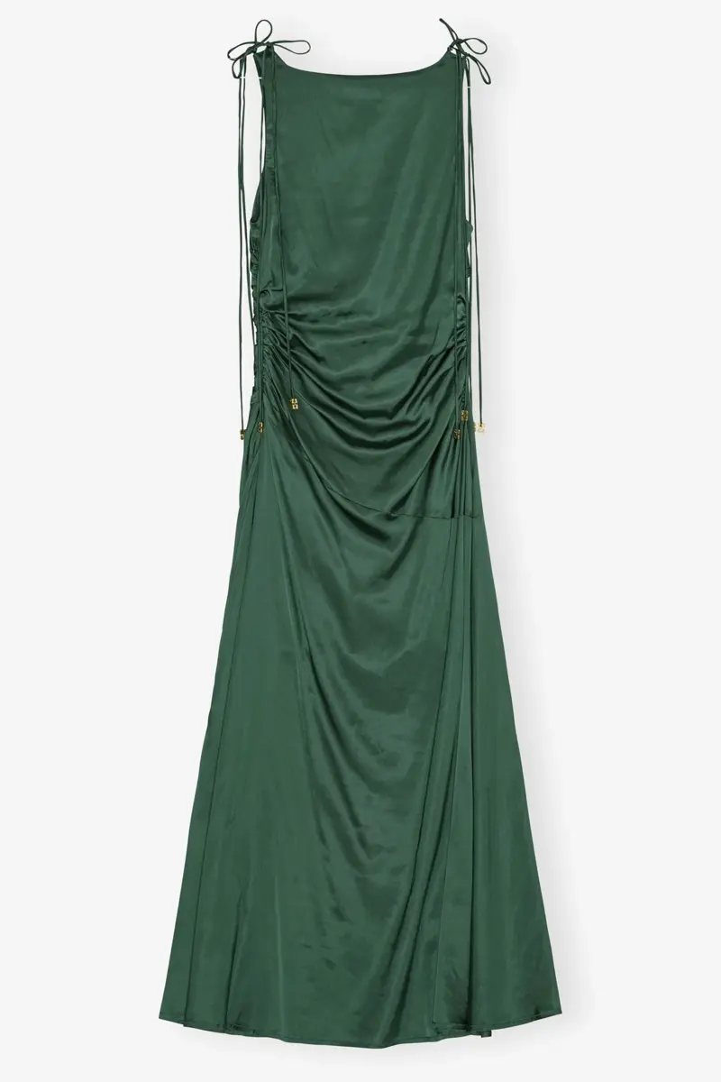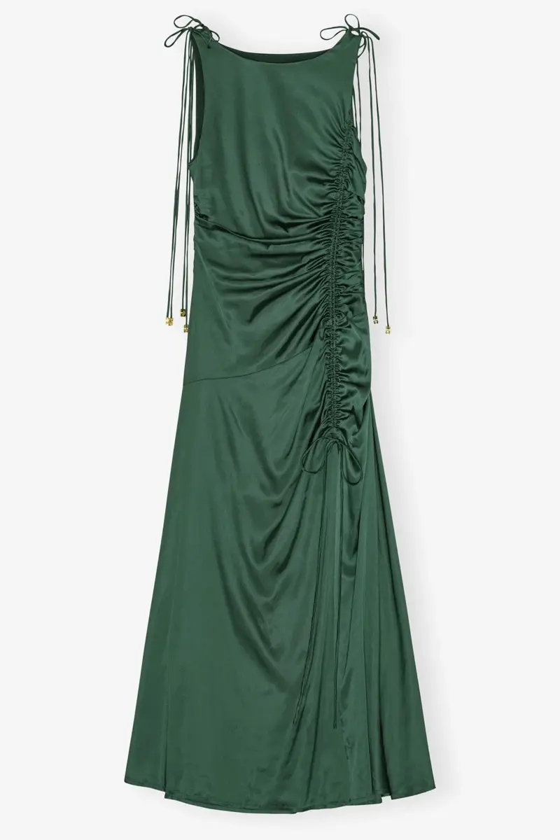 This dress features a round neckline, adjustable shoulder ties, ruching along the bodice and a high slit with GANNI Butterfly logo tie-strings finish.