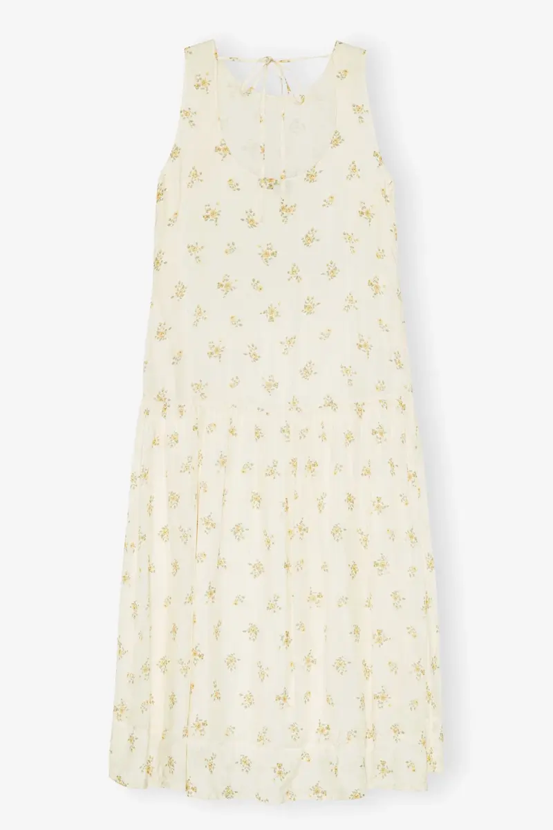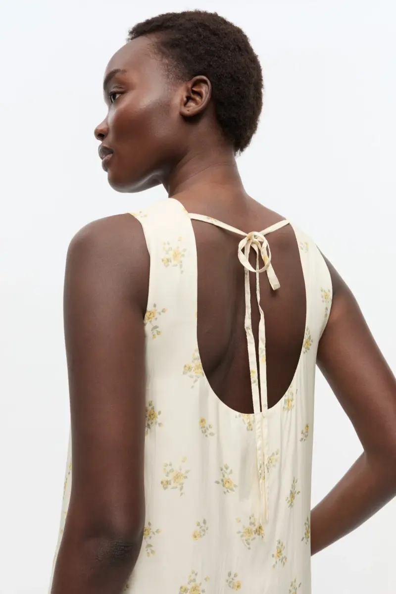 This dress is sleeveless and features a round neckline, tie detail at the back and a dropped waist.