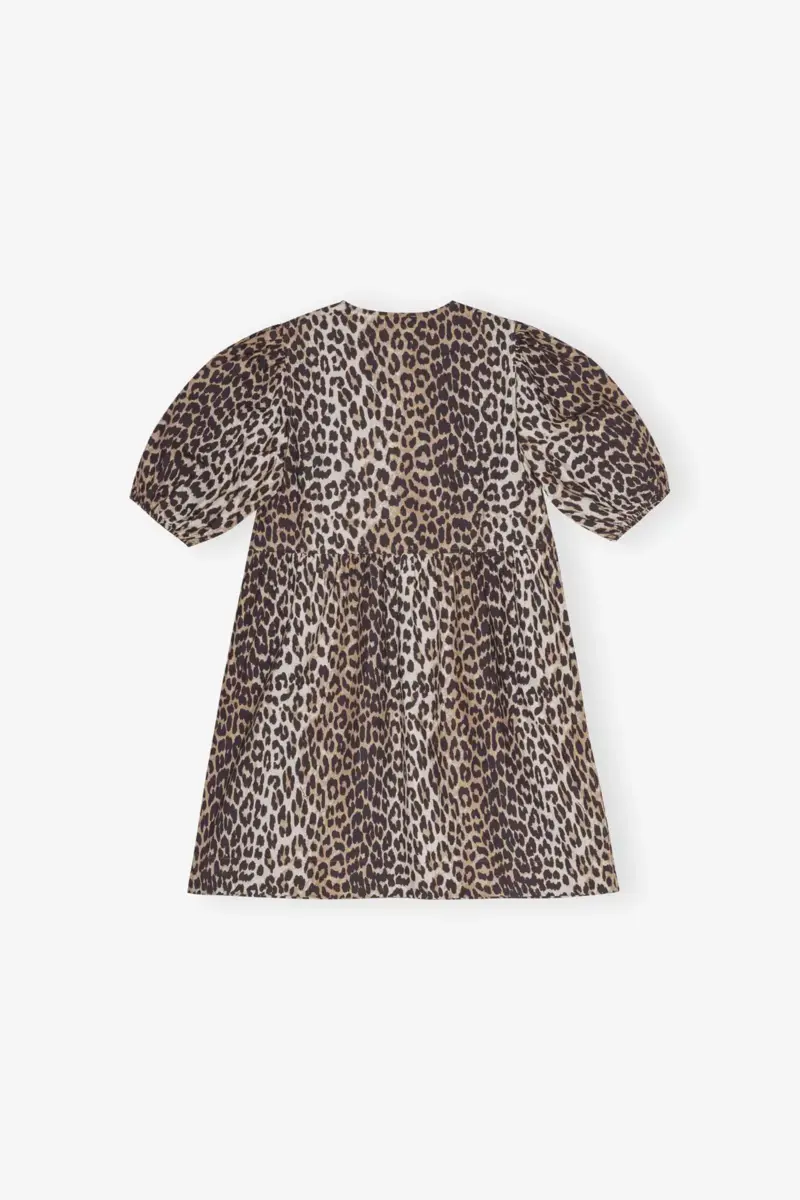 This Leopard Printed Cotton Tie String Mini Dress features an open round neckline with tie closures and puff sleeves with elastic edges.