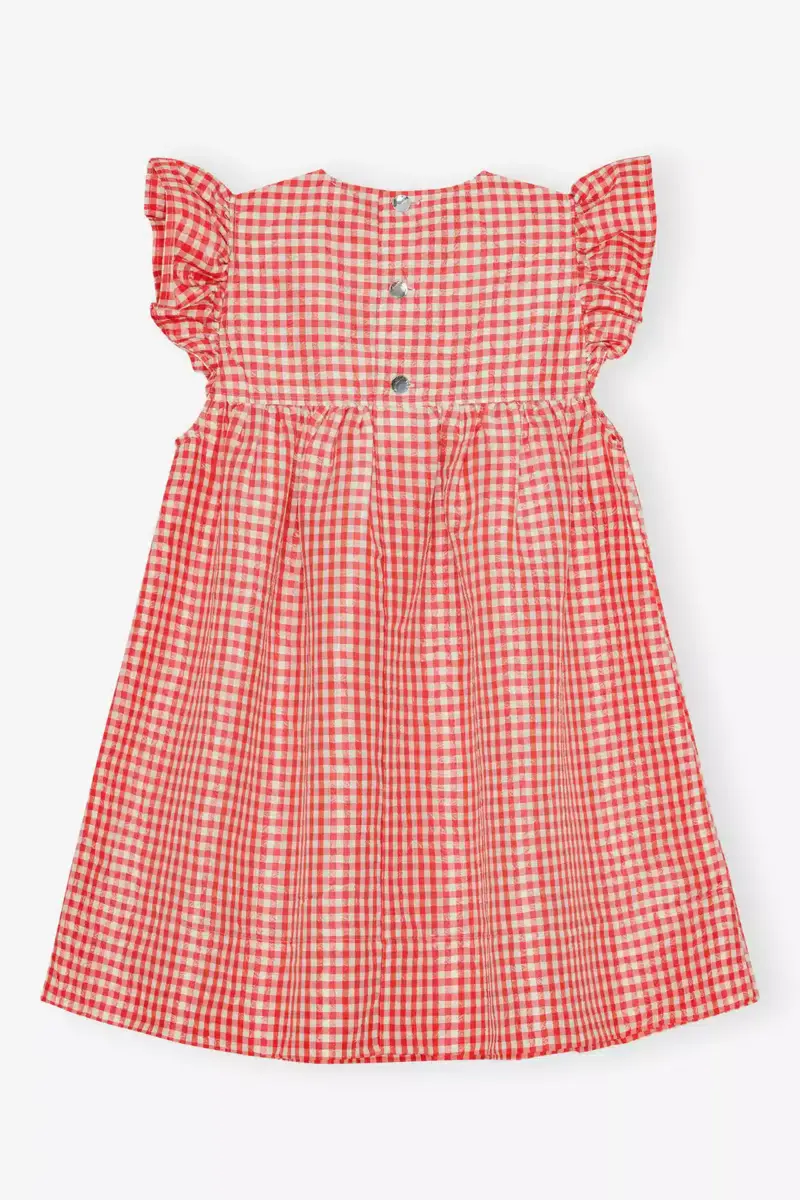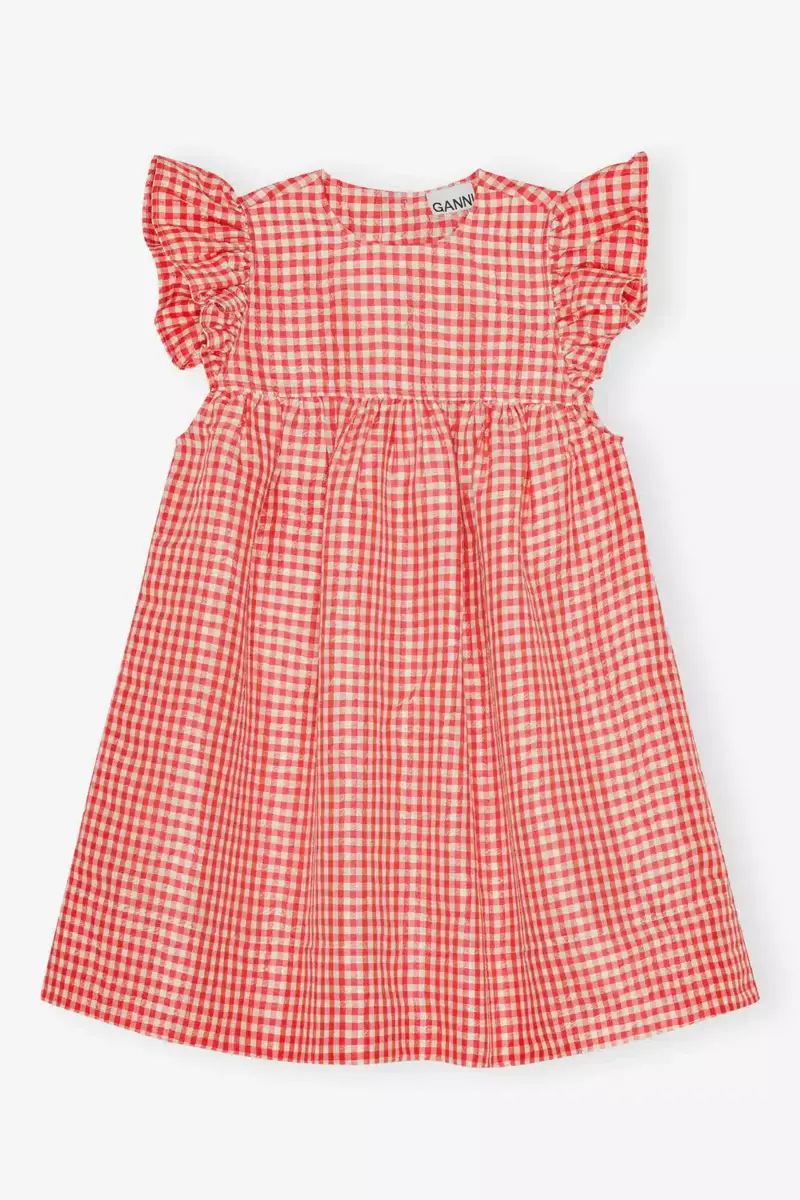 This mini dress features a crinkled taffeta material with a red and white check pattern. It includes frill details on the shoulders and a relaxed silhouette.