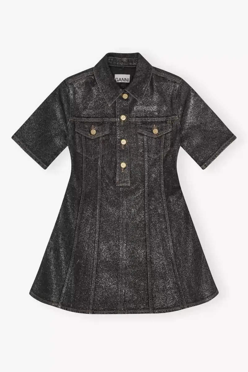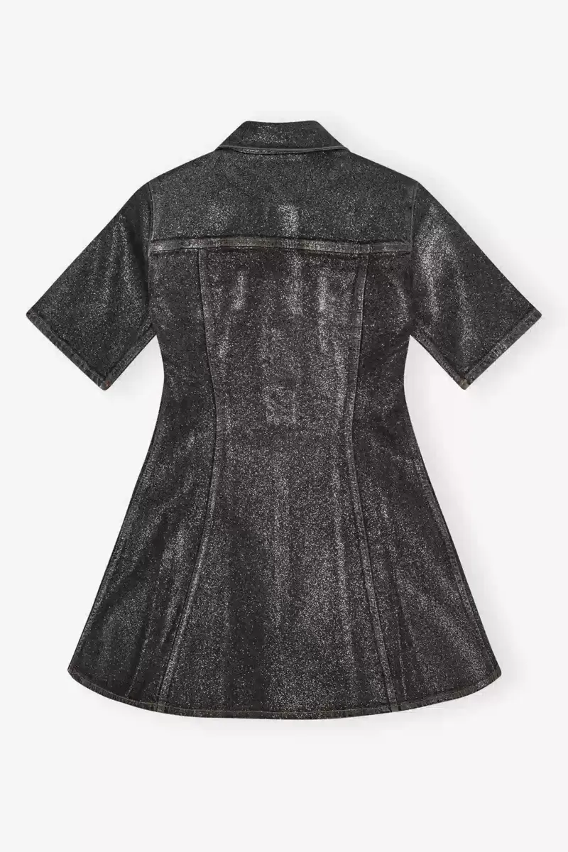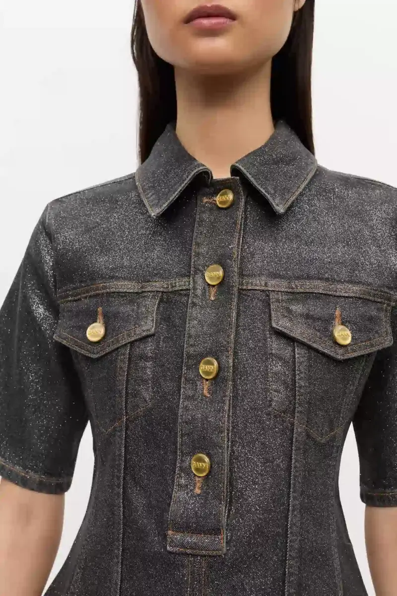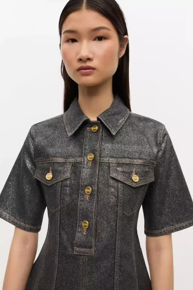 This dress features a shimmery foil finish, a classic collar and button front opening with gold-tone buttons.