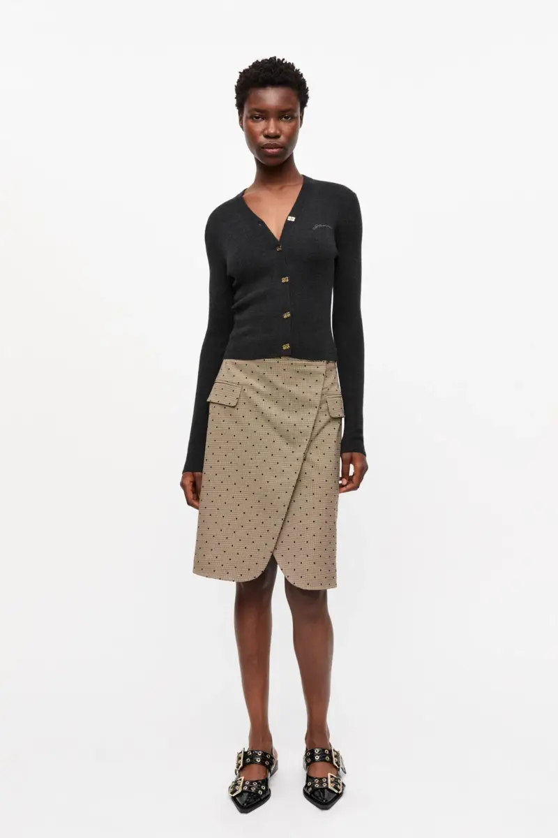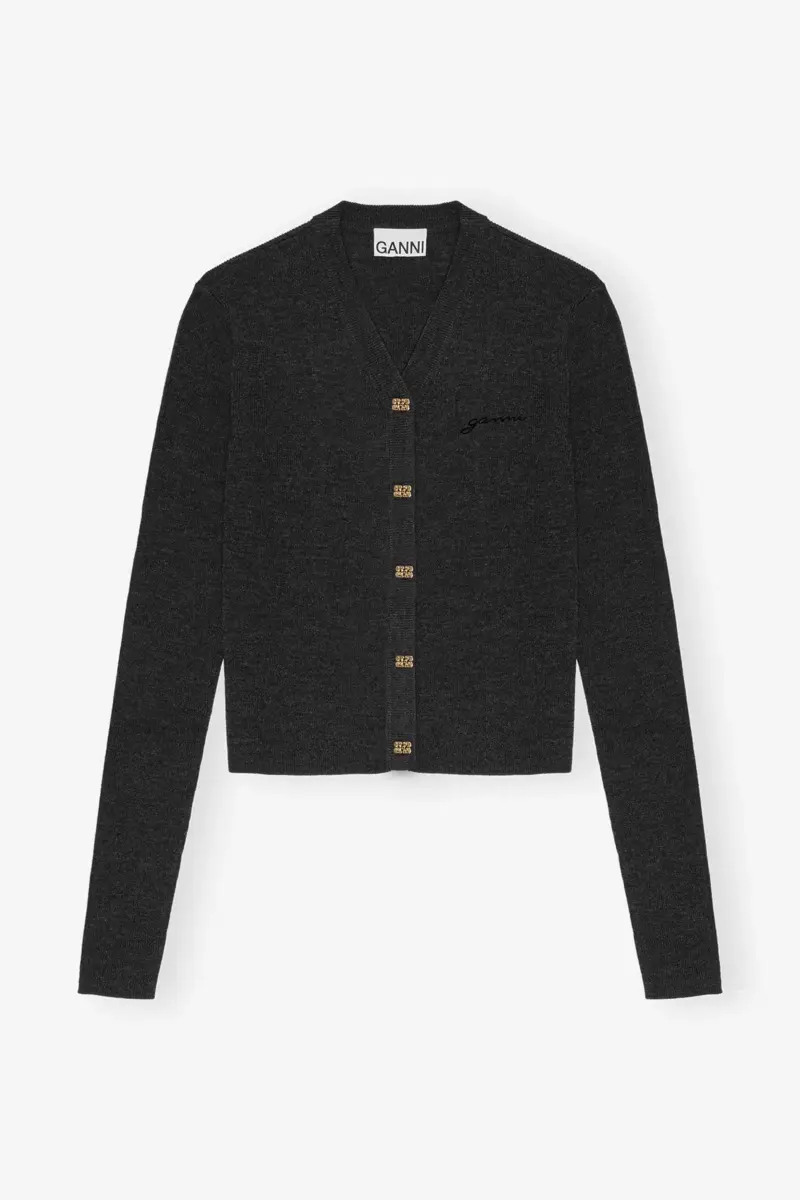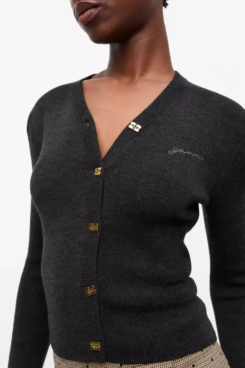 This Black Mini Ribbed Merino Cardigan features a v-neckline, a collar, long sleeves, button closure at the front and a embroidered GANNI logo.