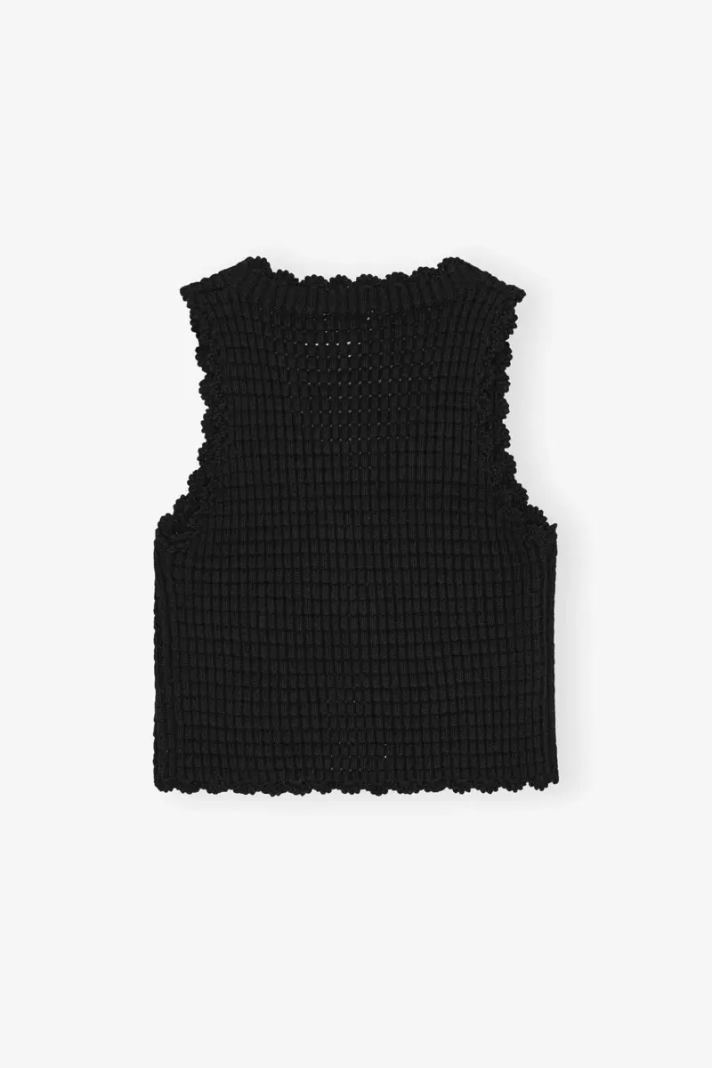 This knitted top features a lace design crafted from organic cotton and cashmere. It has a sleeveless silhouette with a tie closure and gold-tone details.