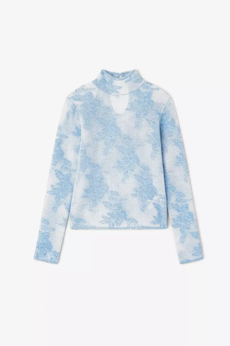 This turtleneck features a sheer flower print, high collar and long sleeves.