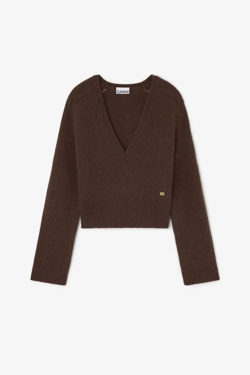 This jumper features a deep v-neckline, long sleeves with rib edges and a GANNI Butterfly logo at the side.