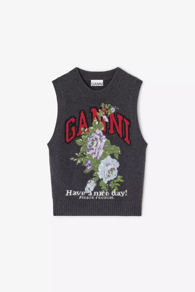 This wool vest features a round neckline, ribbed edges, a rose print graphic and a ‘Have a nice day! Please recycle’ message.