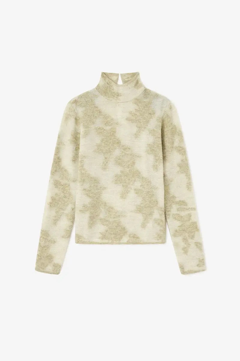 This turtleneck features a sheer flower print, high collar and long sleeves.