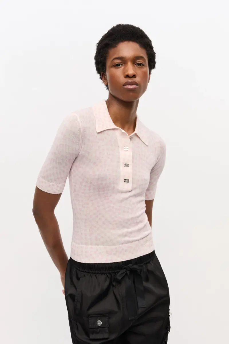 This polo features a check pattern, a buttoned front and a pointed collar.