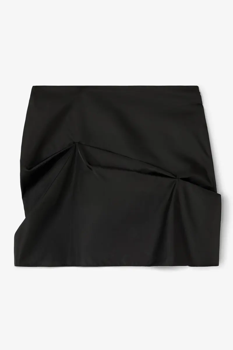 This skirt features a zipper opening and a tuck detail.