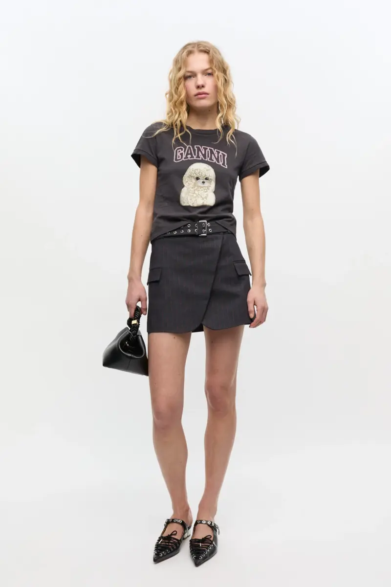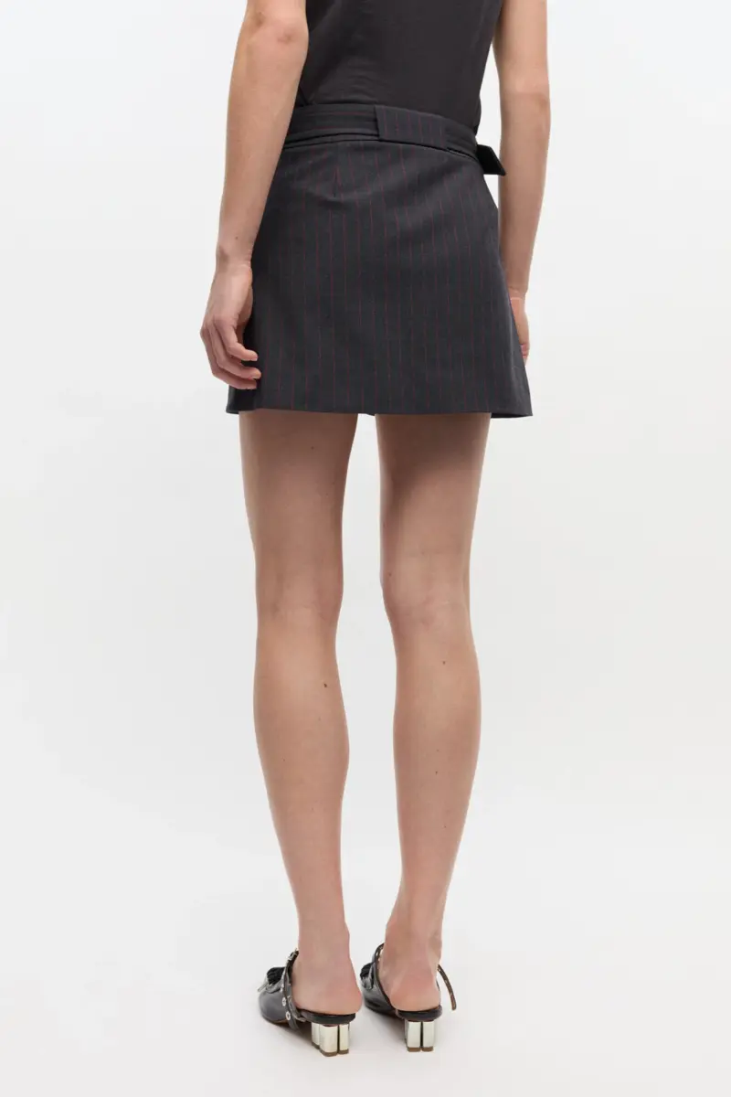 This skirt features a thin red pinstripe design, a matching belt with metallic eyelets and front pockets.