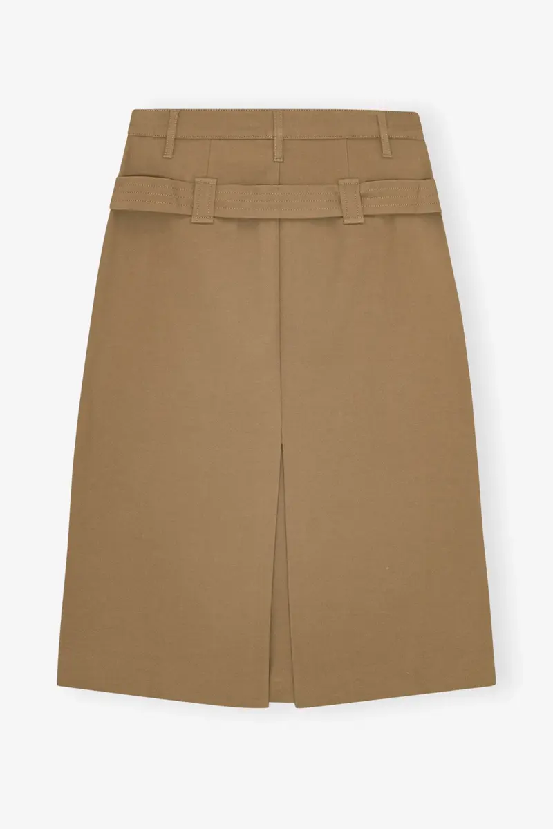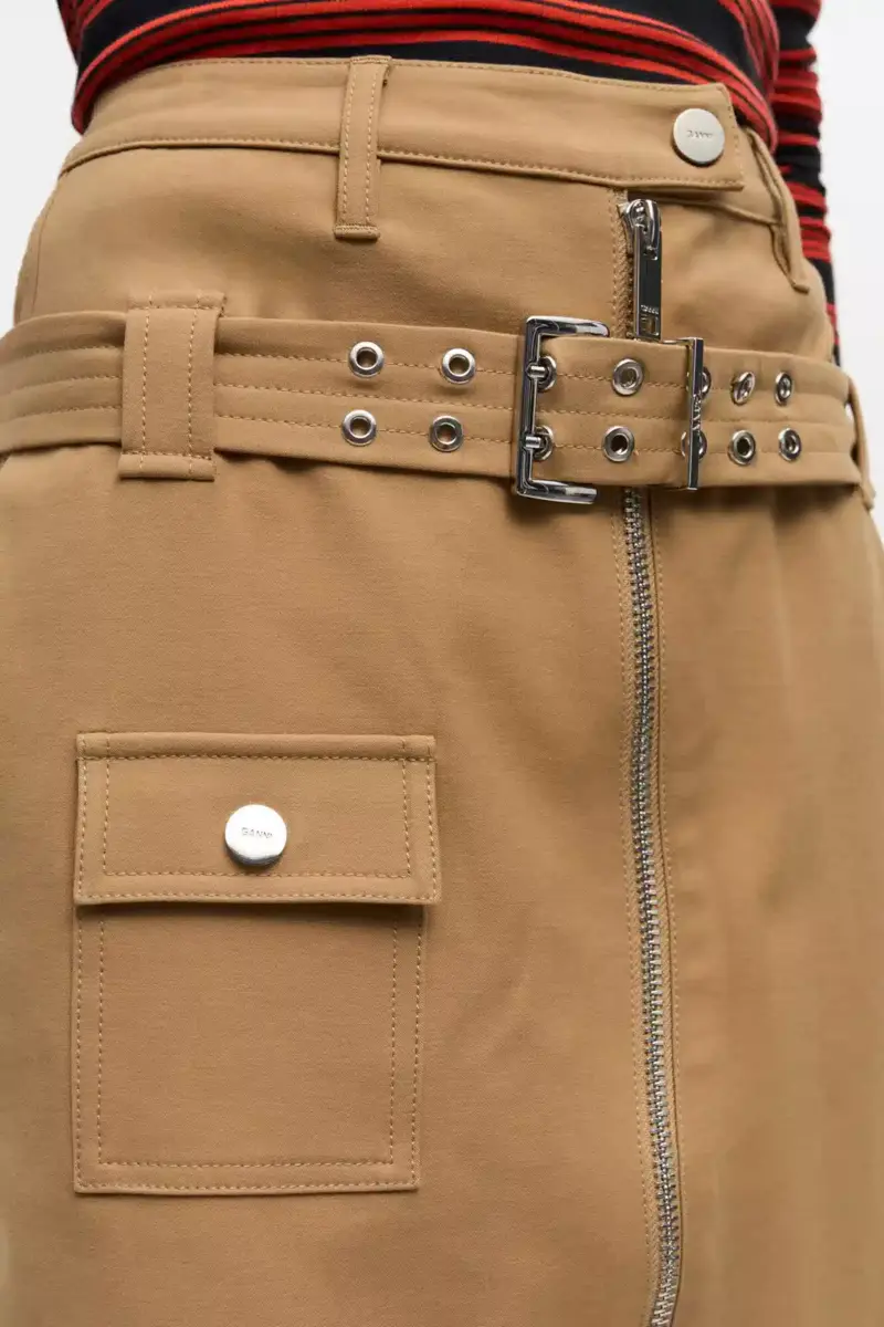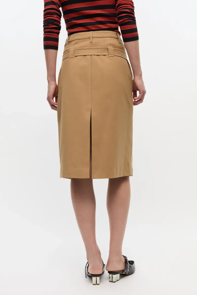 This skirt is made from heavy cotton tailoring, which provides a structured silhouette. The skirt features a button and front zipper closure, a matching belt with metallic eyelets and