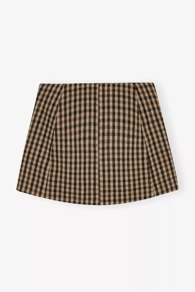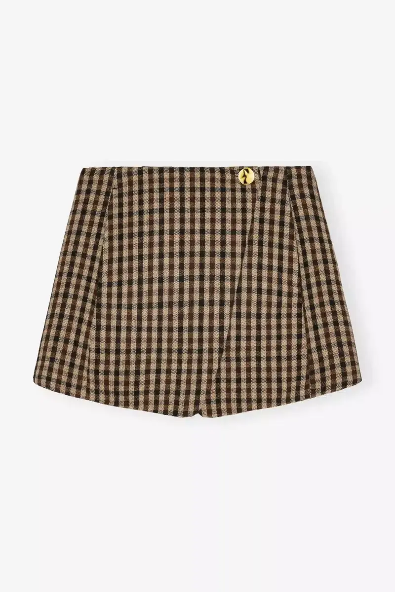 This mini skirt features a check pattern and crossover front design with gold-tone button closing.