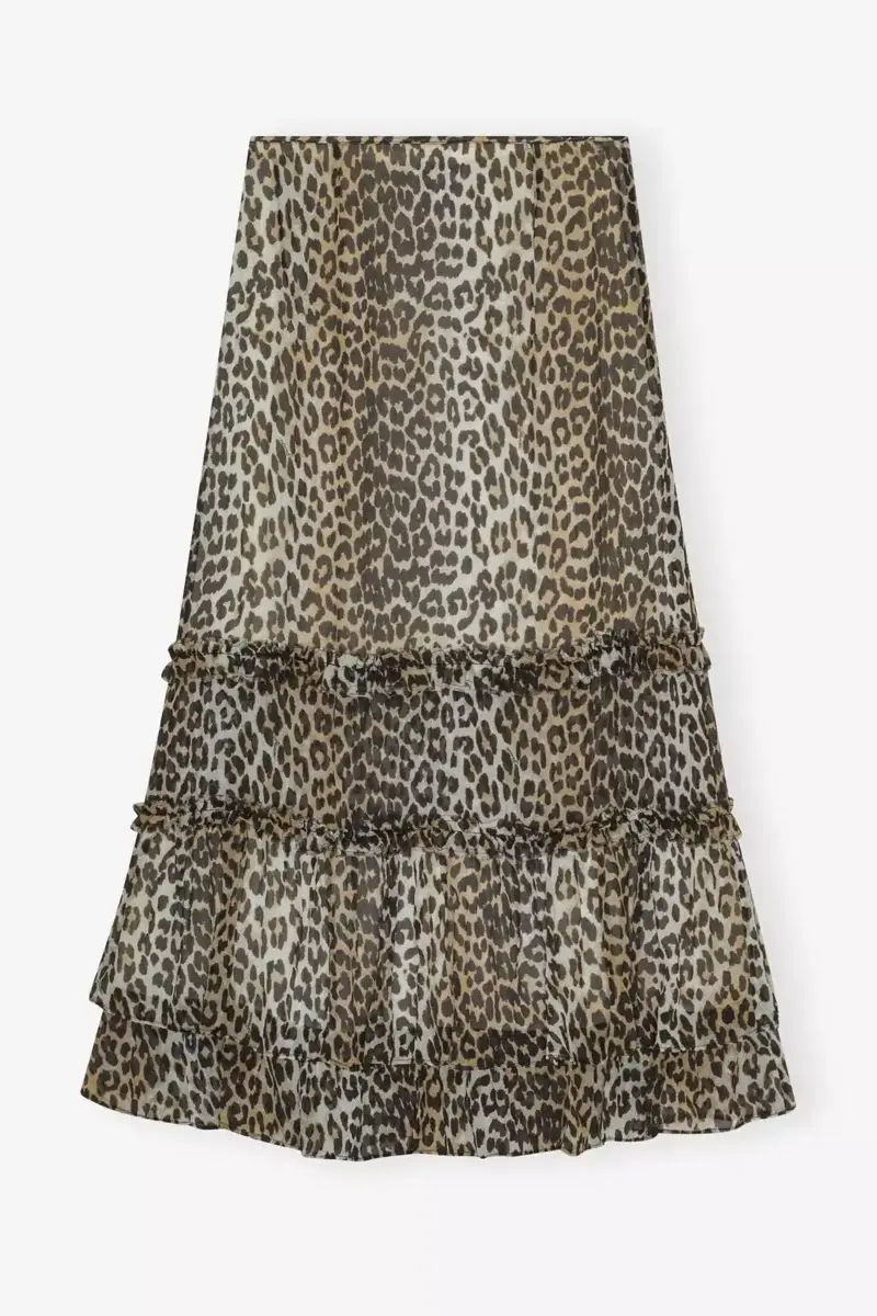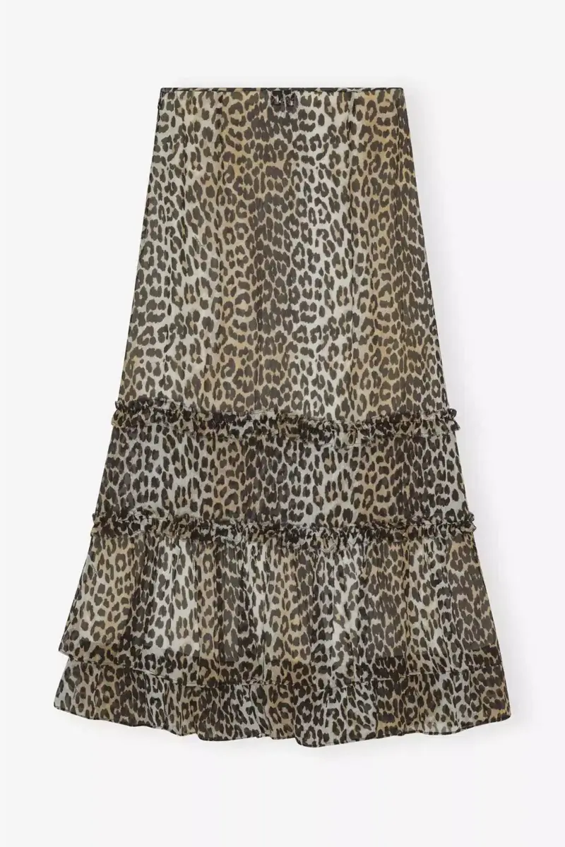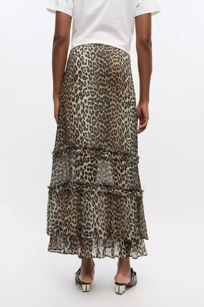 This skirt features a flowing silhouette, layered structure, ruffle details and an all-over leopard print.