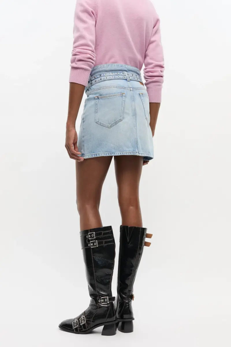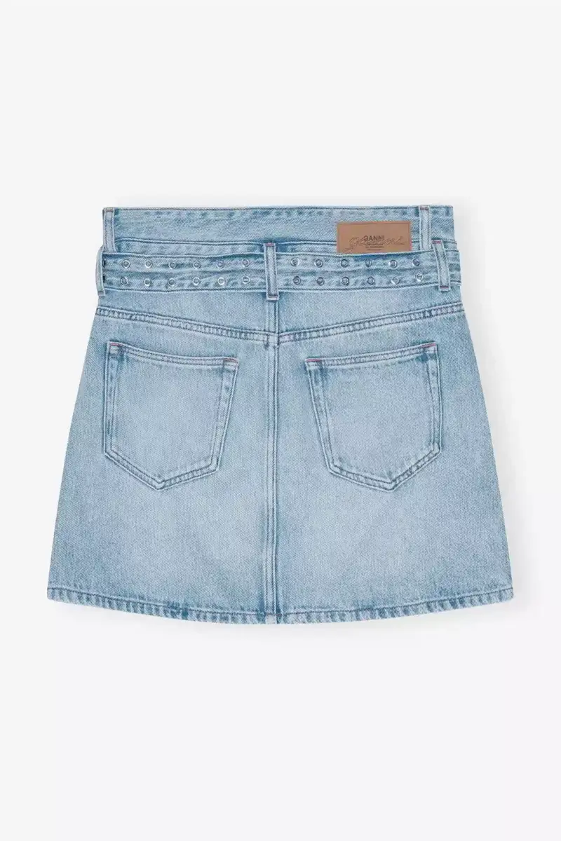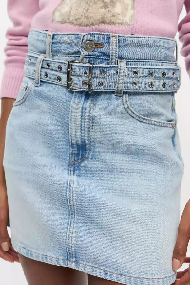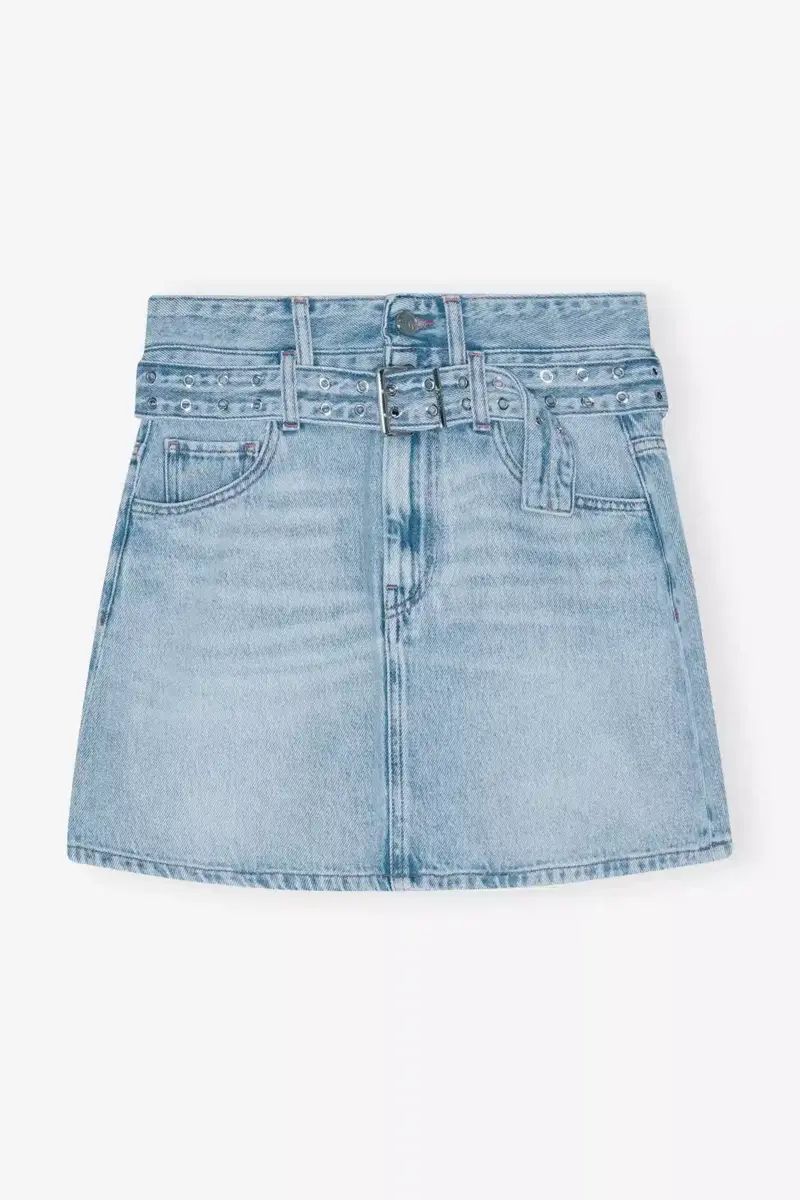 This skirt is crafted from light blue denim with a stone-washed finish, featuring a double belt with metallic eyelets. It has a classic five-pocket design and a front zip and button cl