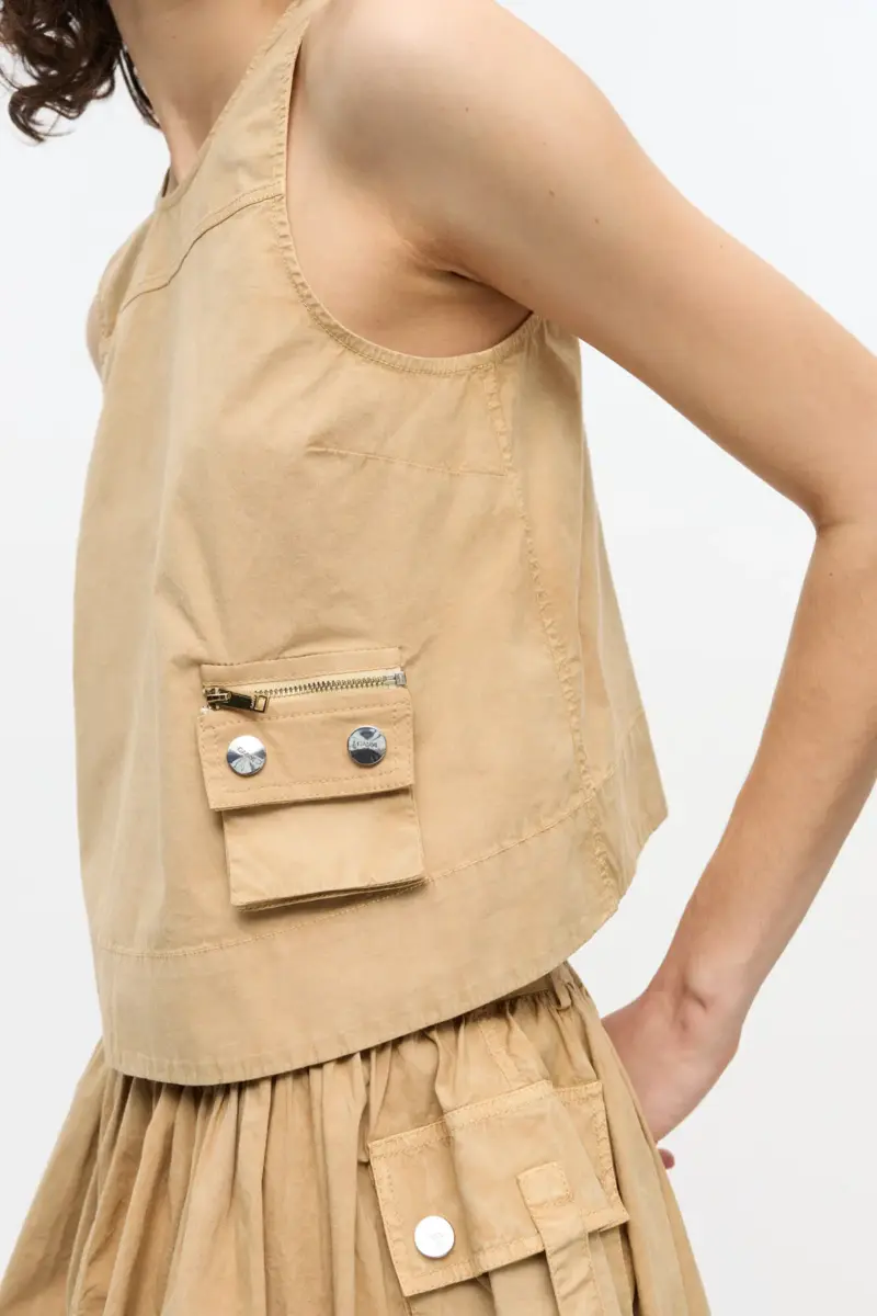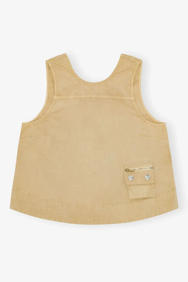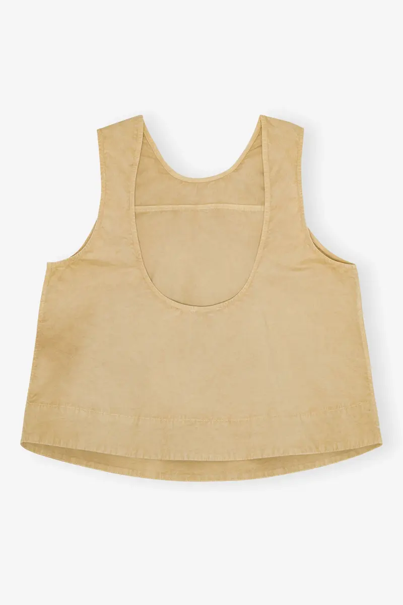 This Beige Washed Stretch Cotton Sleeveless Top is sleeveless and features a round neckline.