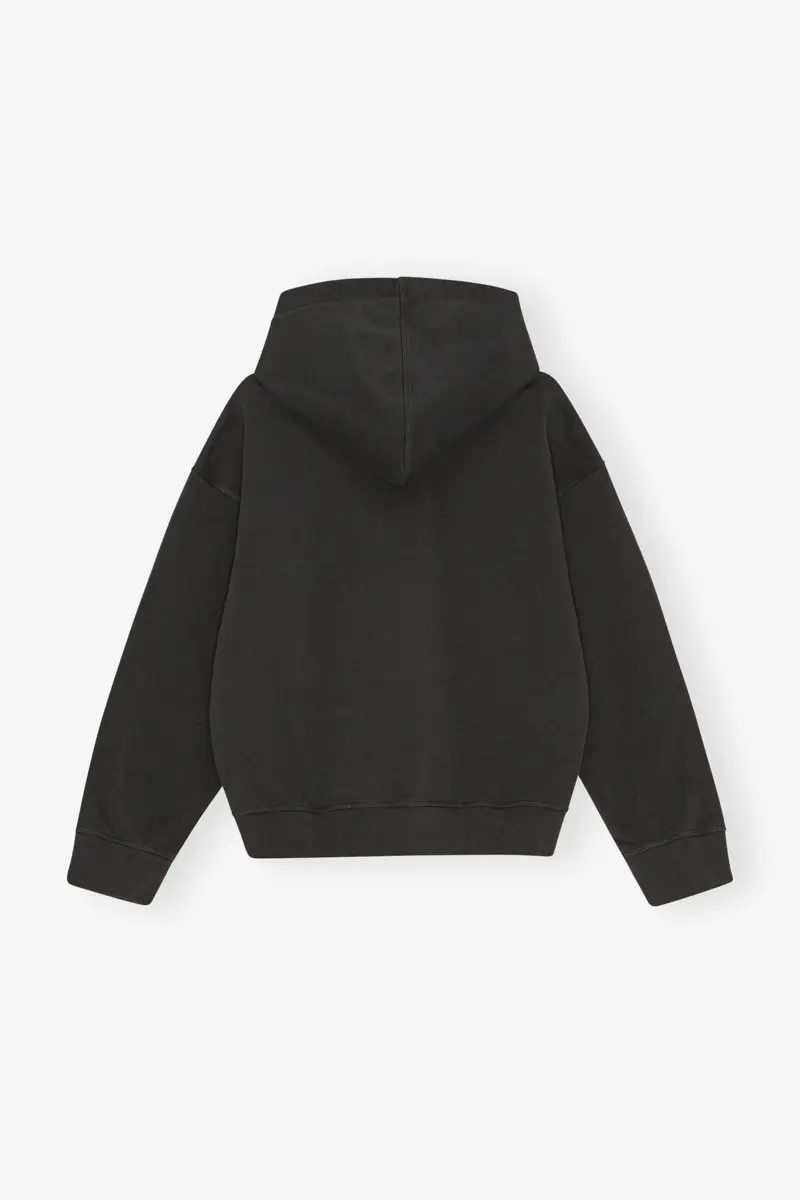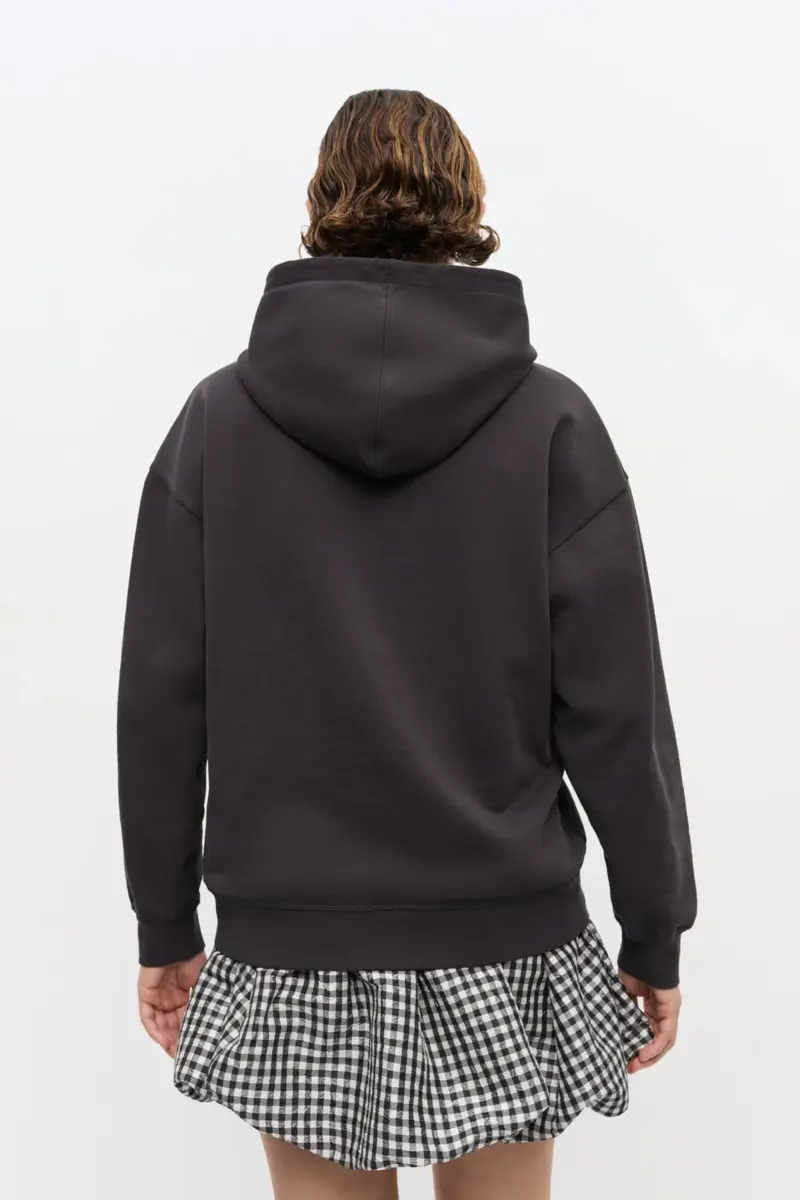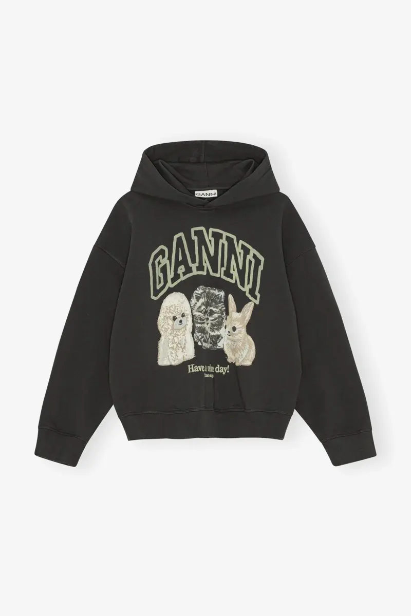 This hoodie features long sleeves with ribbed cuffs. The hoodie has a animal print graphic with a dog, cat, and rabbit on the front, and a ‘Have a nice day! Please recycle!’ message.