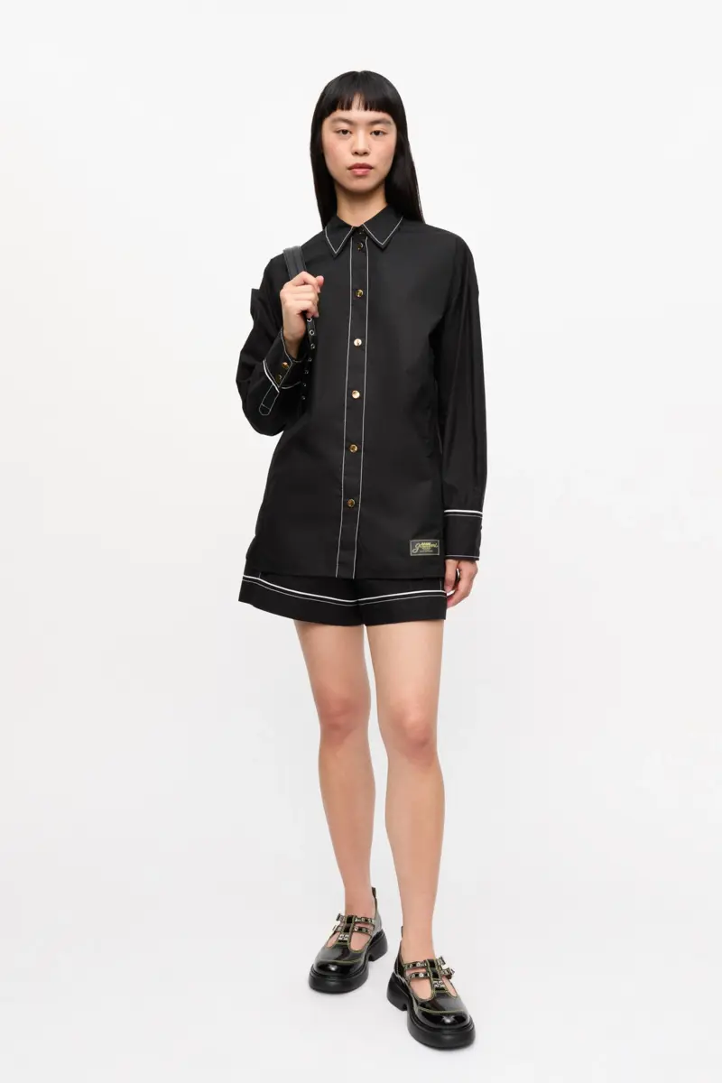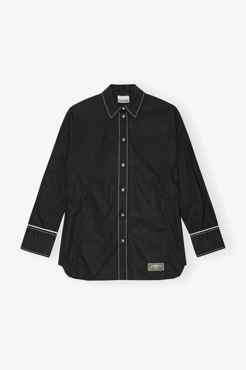 This Black Cotton Poplin Raglan Shirt features a collar, a button closure, long sleeves with buttoned cuffs and a sewn-on GANNI logo patch.