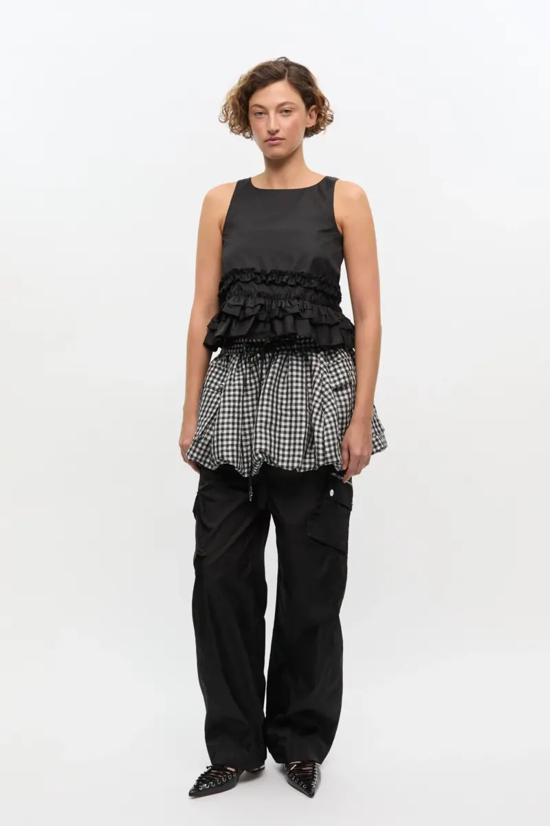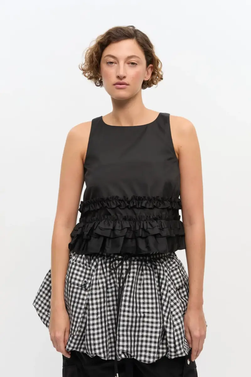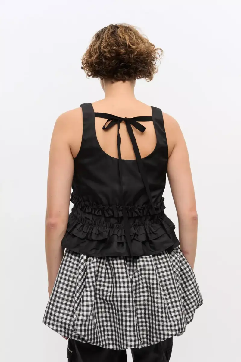 This top features a U-neckline, a ruffled hem and an open back with a tie closure.