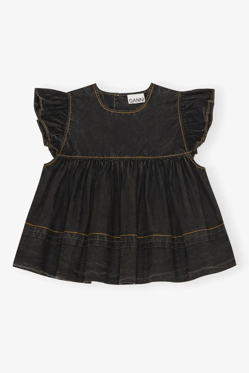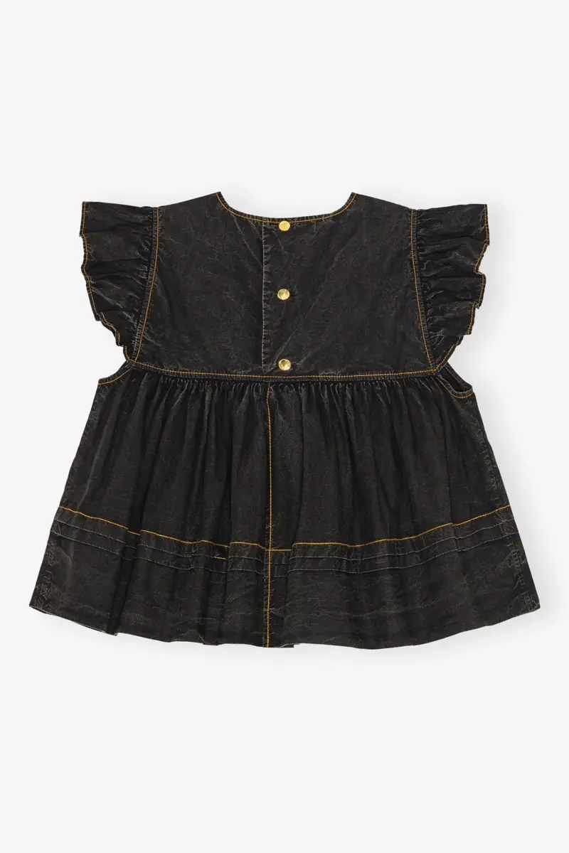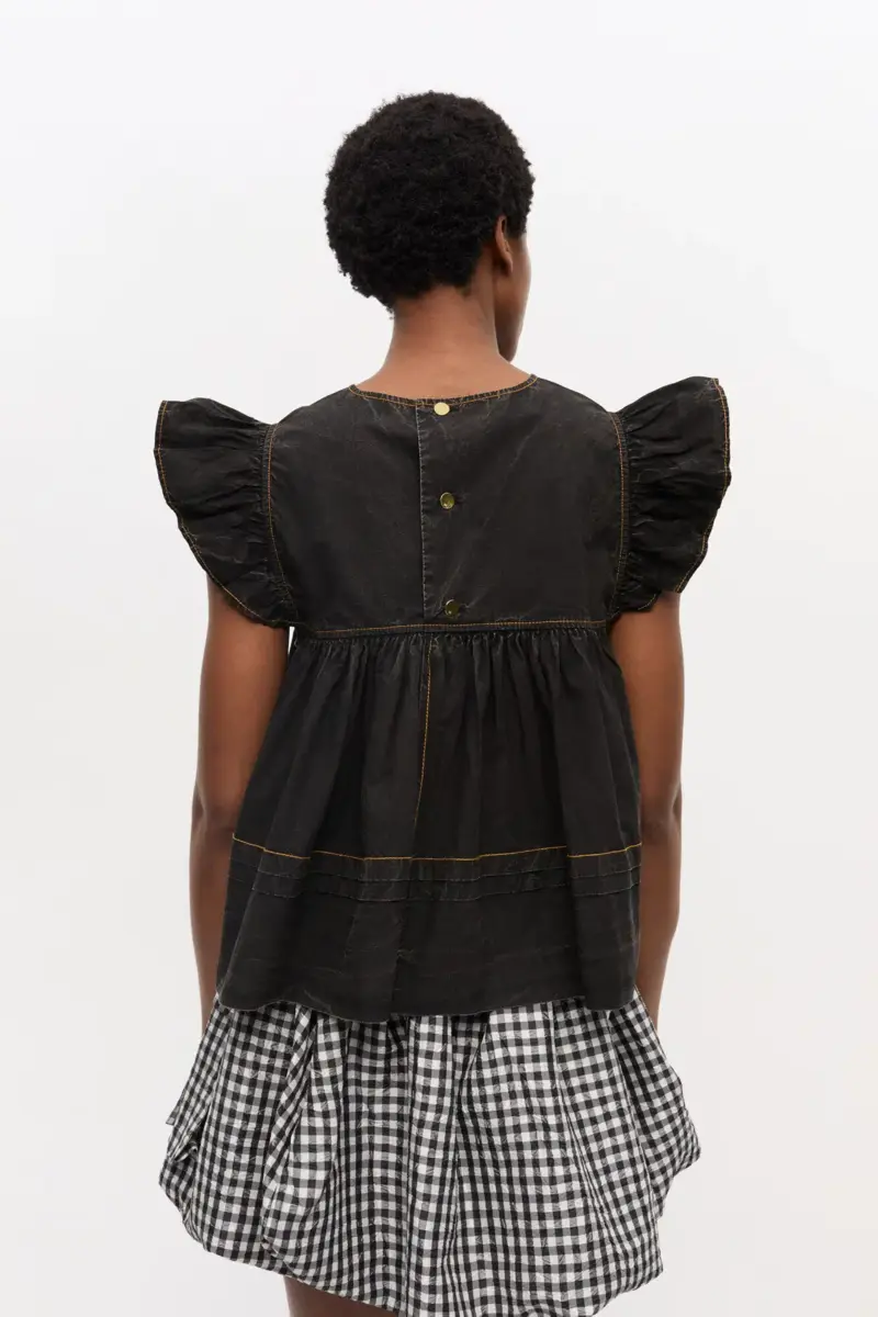This top features a washed look, short frill sleeves, and pleated hem detailing. It has a round neckline and a three-button closure at the back.