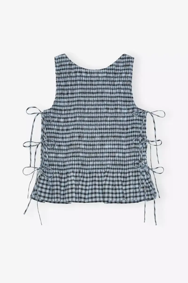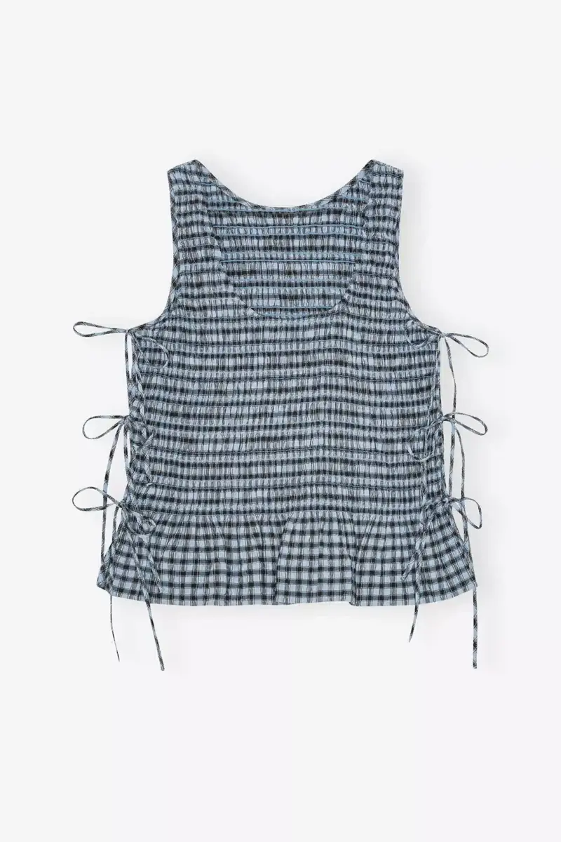 Blue Seersucker Check Smock Tie String Top