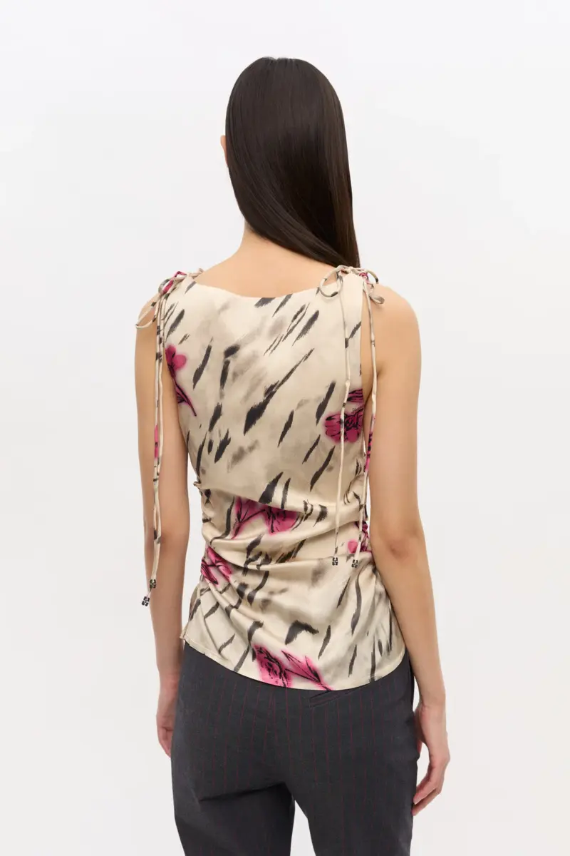 This top in floral printed stretch satin features adjustable shoulder ties and a draped side detail.