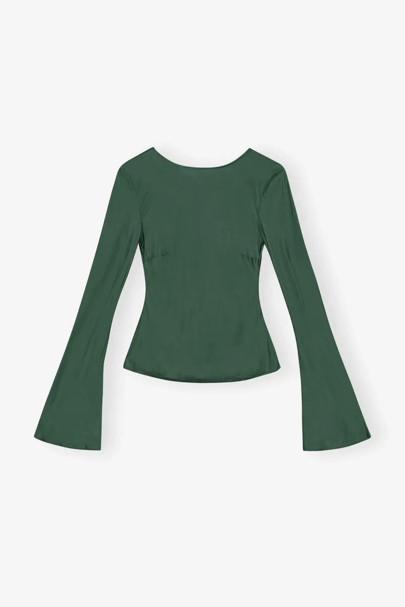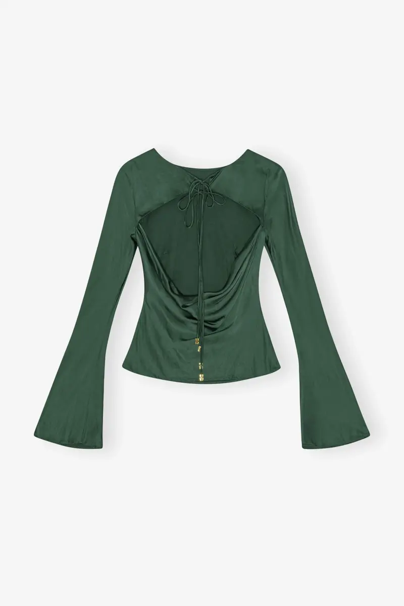 This blouse features a round neck, long sleeves, open back and tie-strings with GANNI Butterfly logo finish.