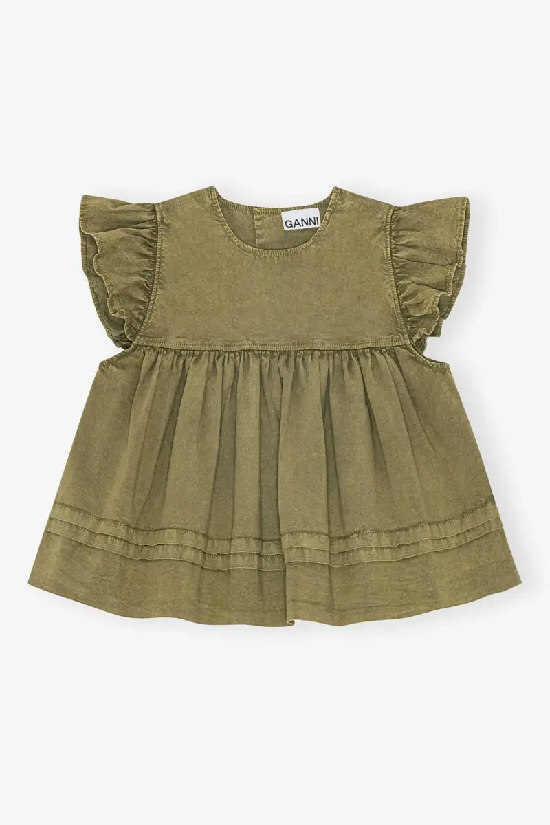 This top features a washed look, short frill sleeves, and pleated hem detailing. It has a round neckline and a three-button closure at the back.
