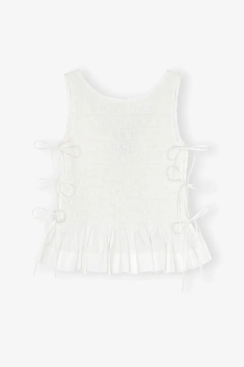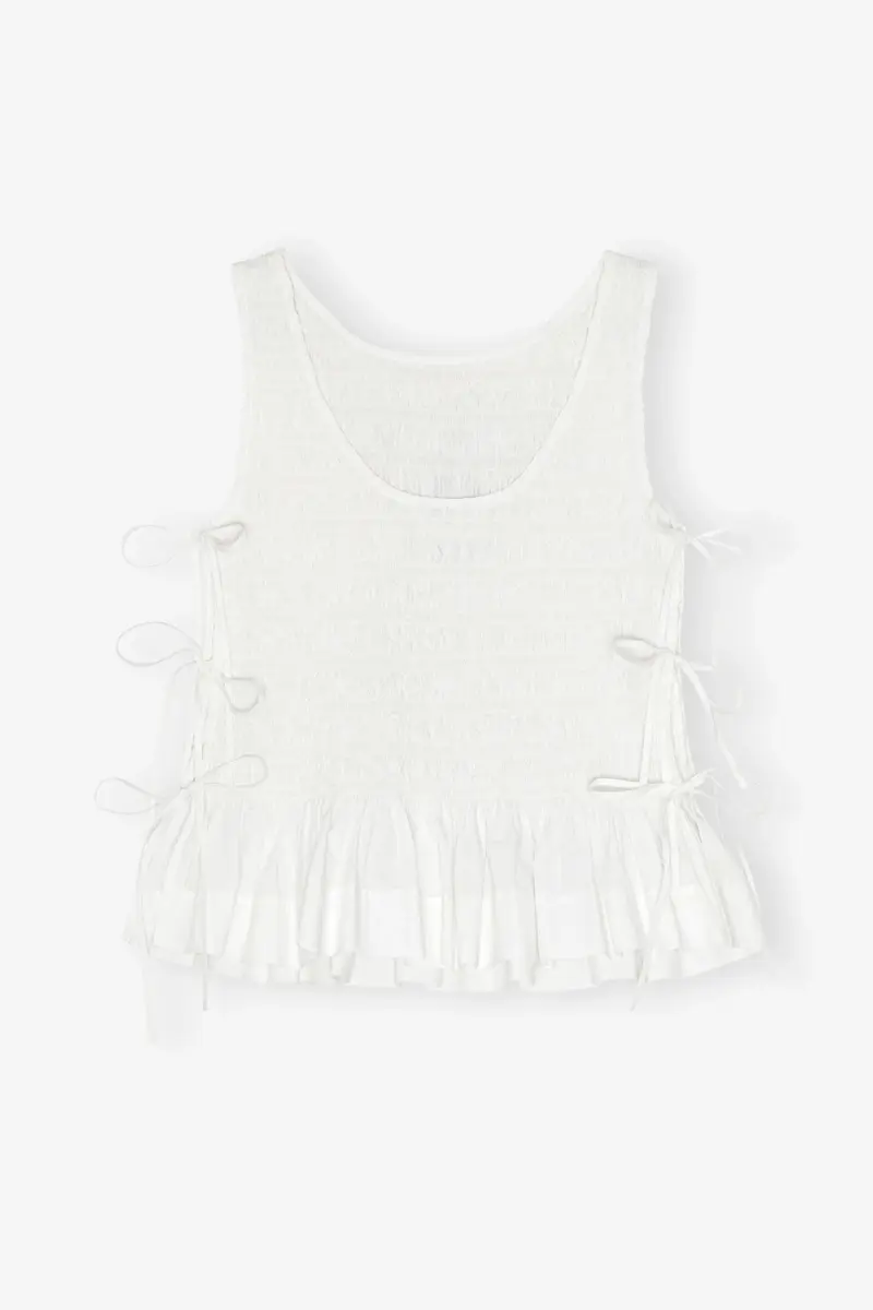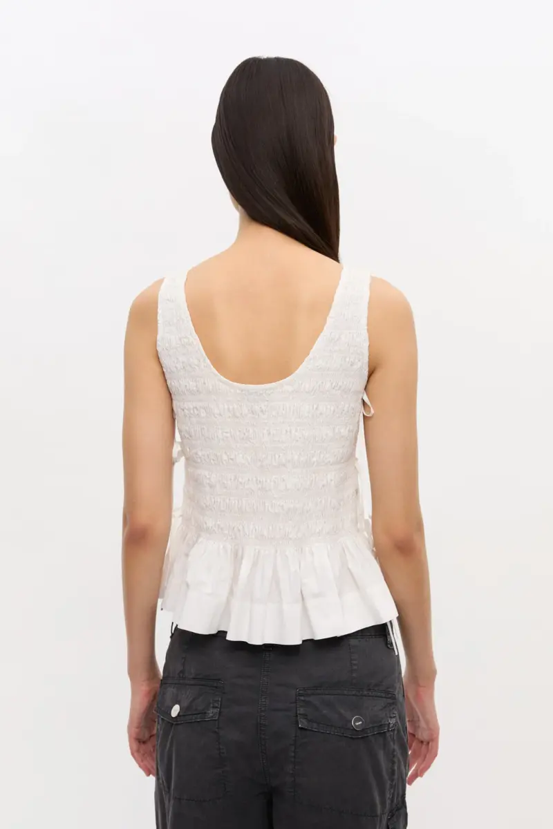 This top is sleeveless and features a smocked texture, tie details along the sides, a scoop back and a ruffled hem.