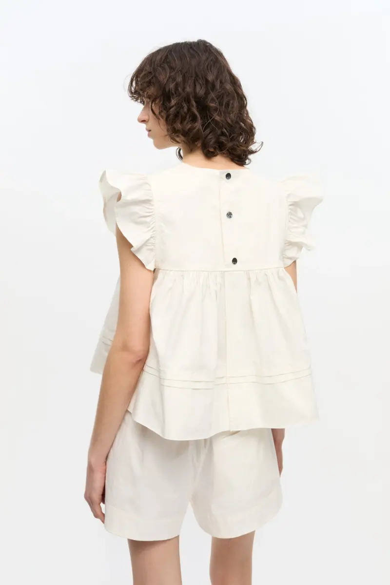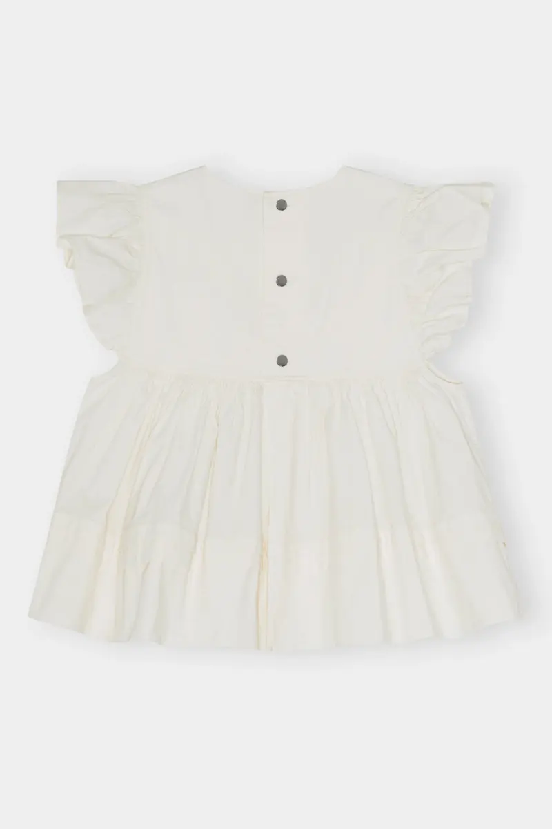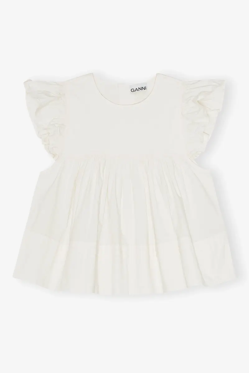 This White Stretch Cotton Frill Sleeve Top features a round neckline, short sleeves with ruffle details and an embroidered heart with GANNI logo.