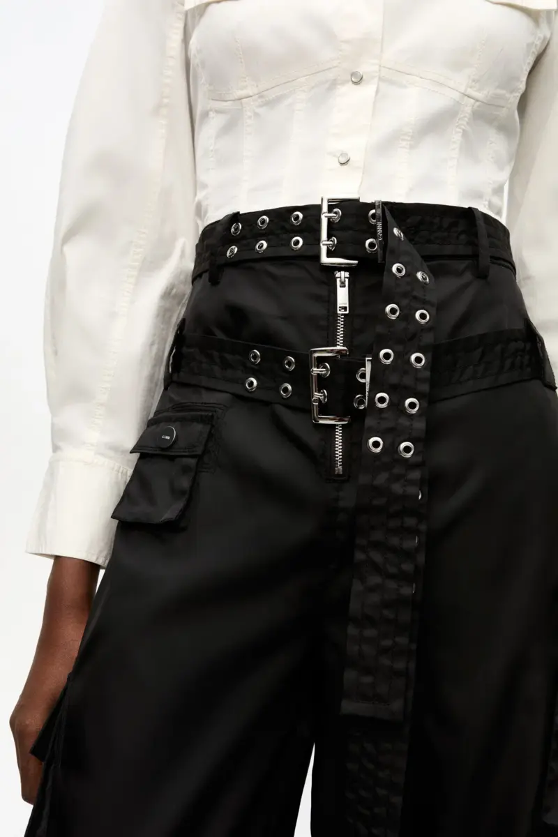 These trousers feature a heavy silver zip closure, two adjustable, removable belts at the waist, a front pocket and two side pockets.