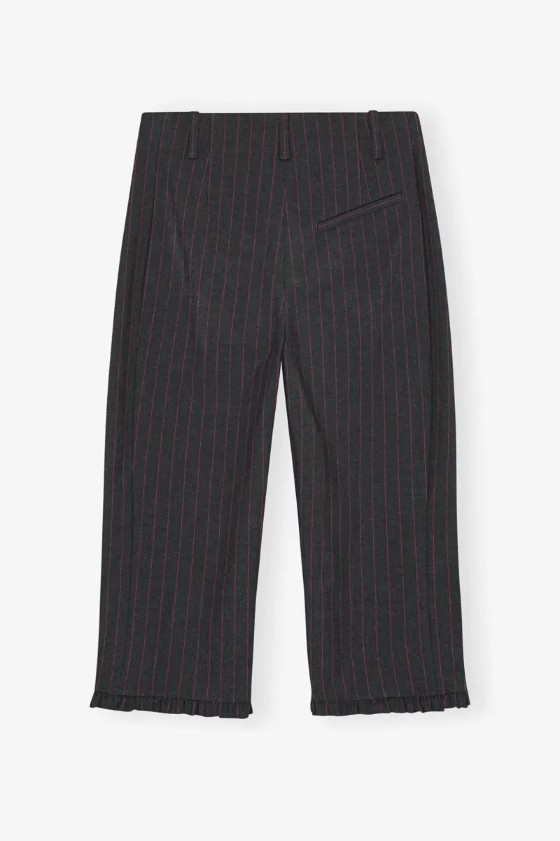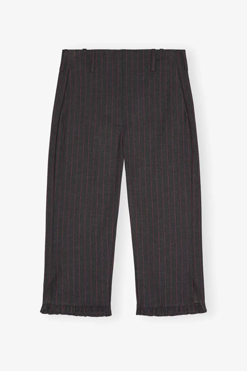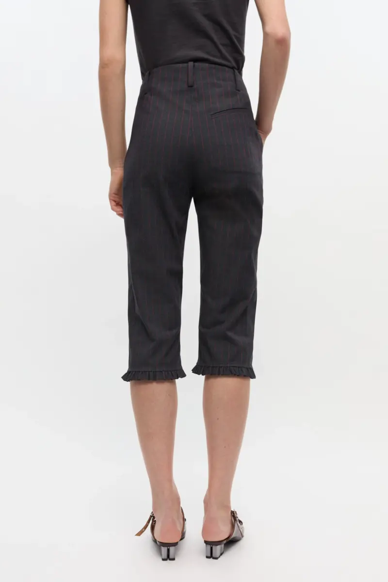These carpi trousers feature a thin red pinstripe, belt loops, two side pockets and a ruffle detail at the hem.