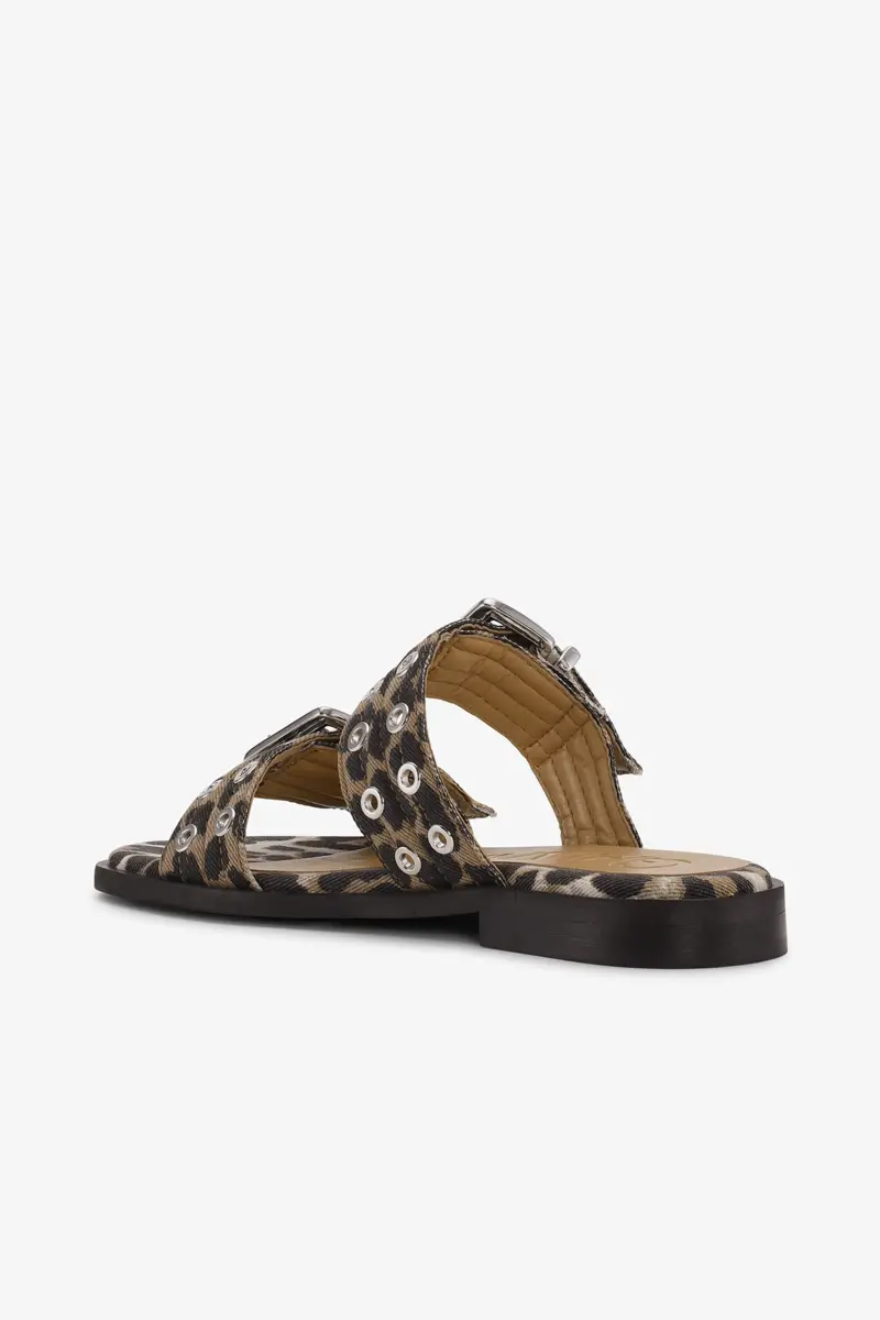 Feminine Buckle Two-Strap Sandals in Leopard Denim
